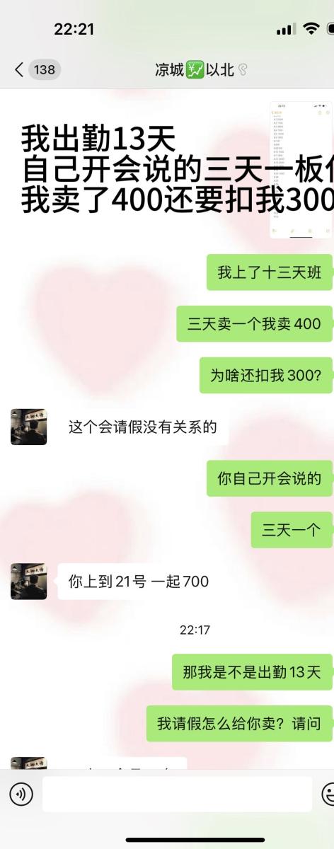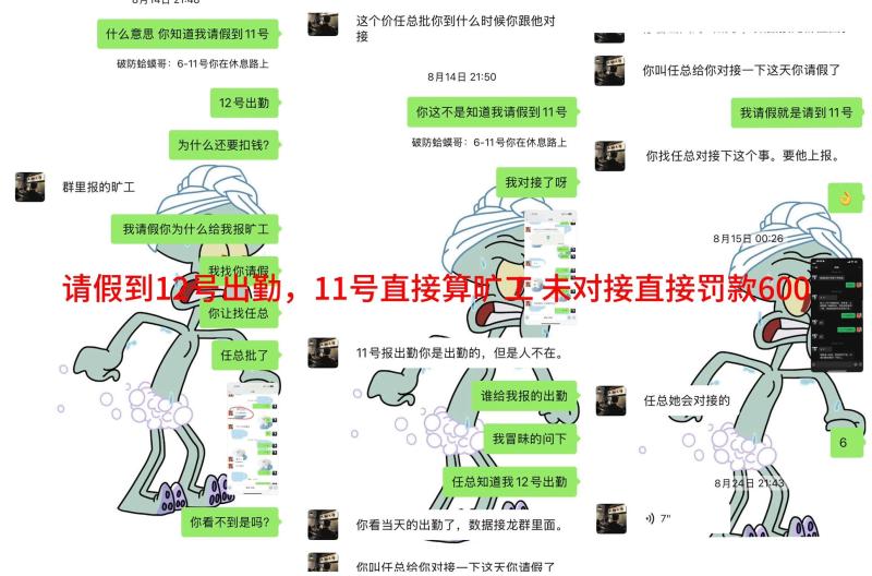4.女孩子请假直接算旷工罚600 各种病假事假批的非常难 甚至不给女孩子批假 让女孩子去报警(李春刚不去了解女孩请假到几号 直接算旷工 去找他不去解决问题 全部怪在队长身上 让女孩子去处理 )