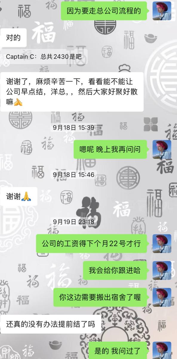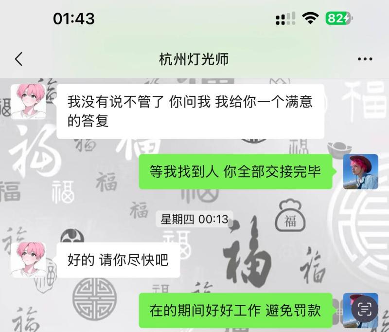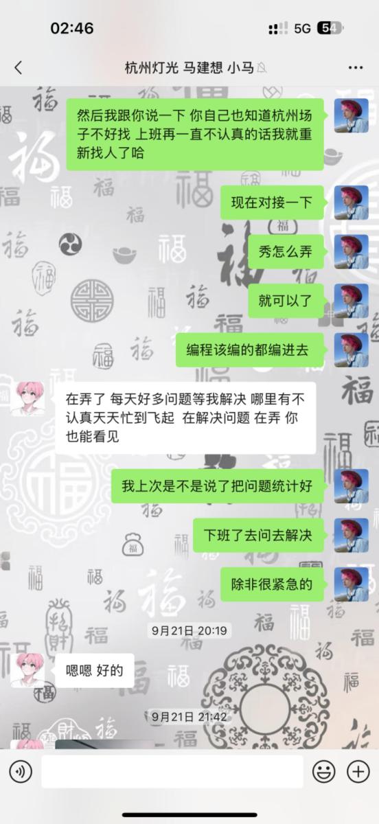 其次他说上一个灯光是被我骂走的,工资至今未发事实是什么样有截图证明,下面第一张图是我跟上一个灯光的聊天记录,因为每个公司都有每个公司的规章制度,给人家也是说的很清楚什么时候结。