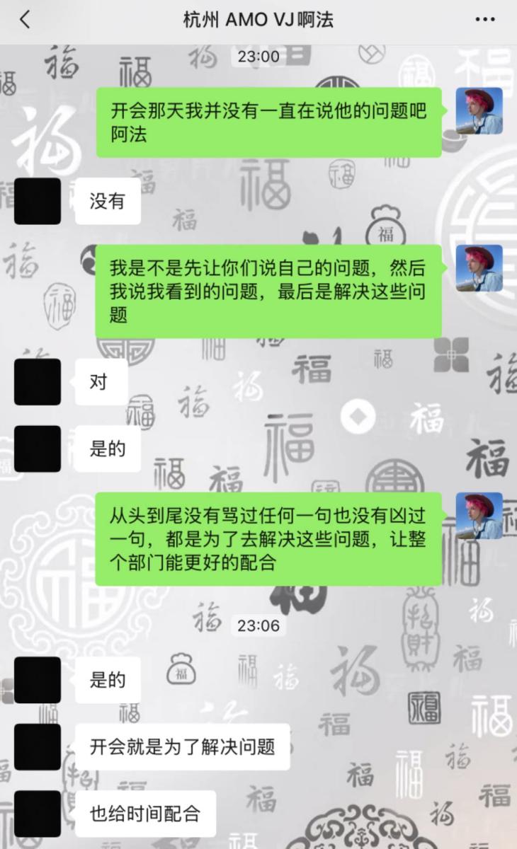 接下来是开会,开会最开始我让每个板块先说这几天自身的问题,然后我再说我看到的问题,最后是解决问题,从头到尾都没有骂过他一句,也没有把责任全部推卸在他身上,开会只为了解决问题,以下第三张截图开始是部门其他员工的证明,以及已经离职VJ的证明,开会说给他跟VJ一个星期磨合时间,并且在会上也说了,有任何问题记在备忘录,下班或者白天去联系厂家解决,前面给灯不及时脱节的事就算了毕竟人家在解决问题导致的,但是现在开完会给他说了这个方案,他还是老样子一直玩手机。