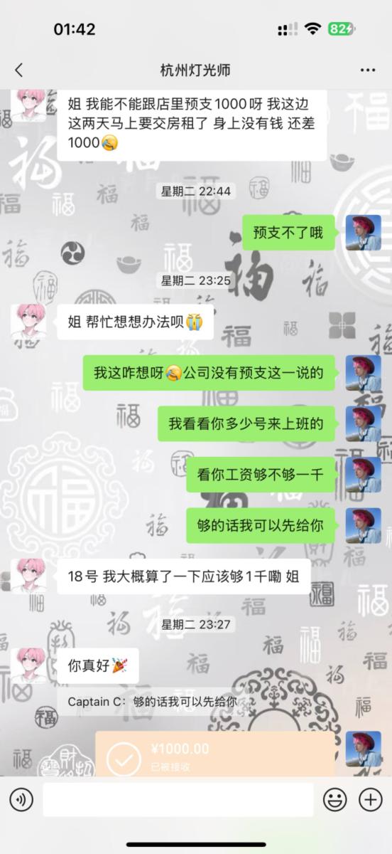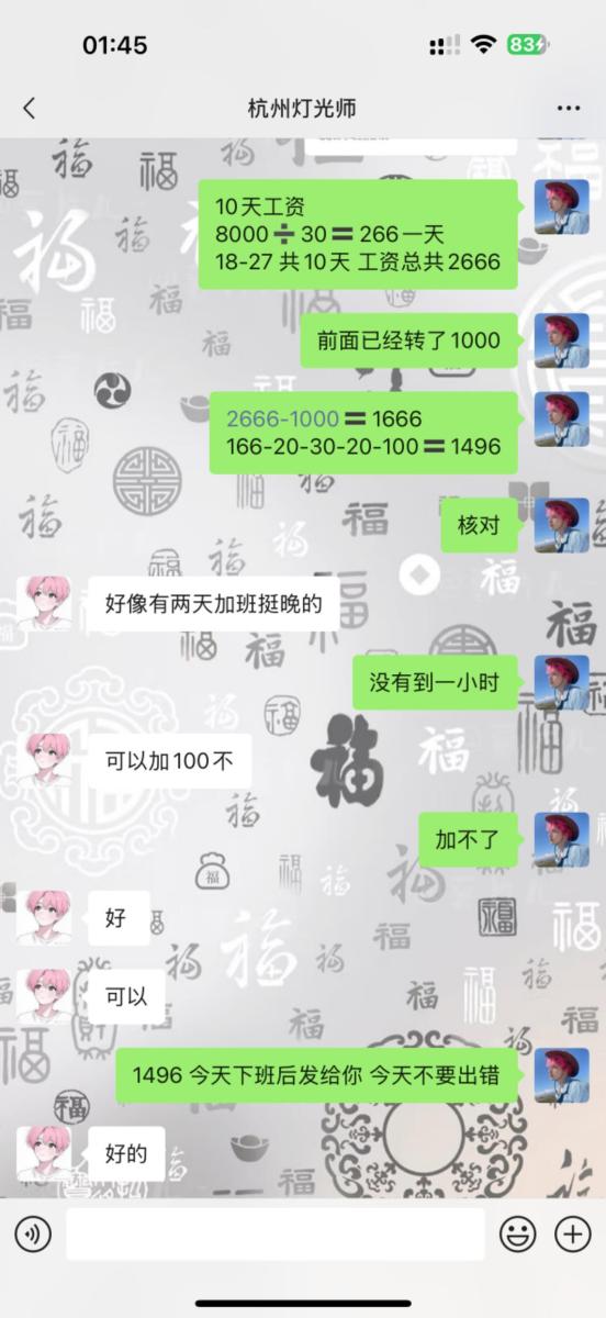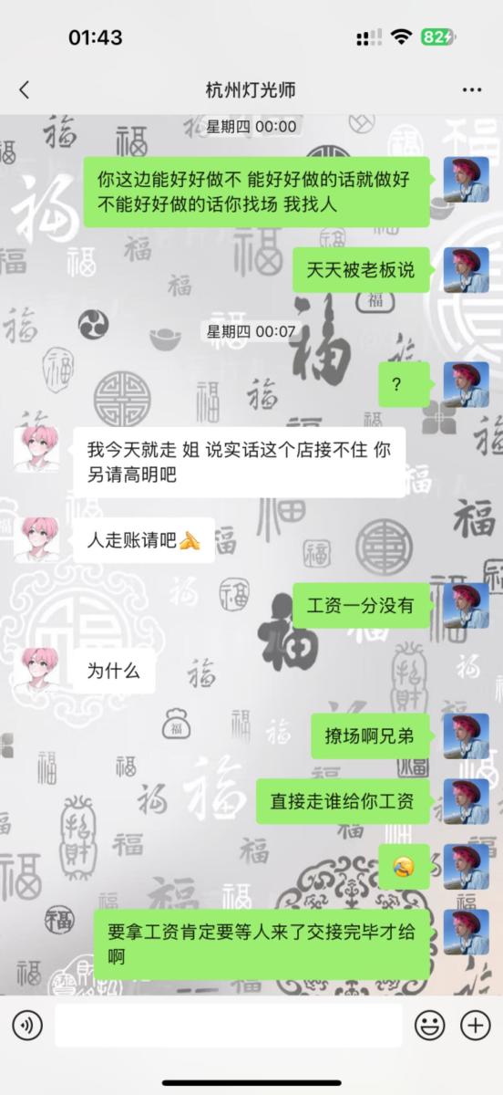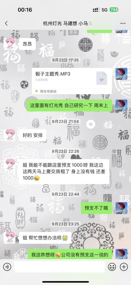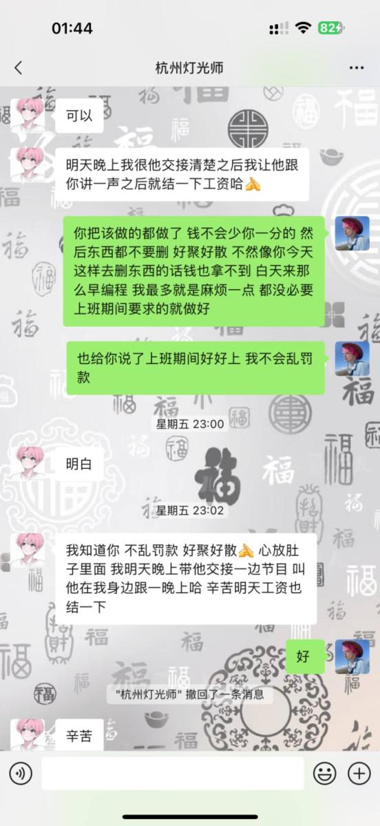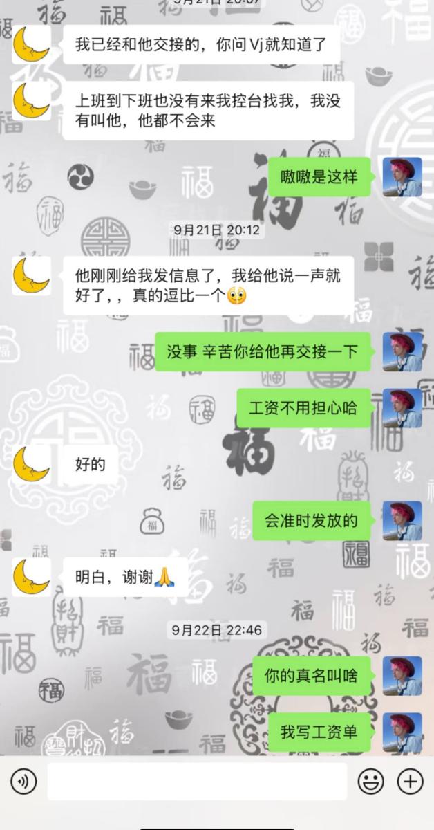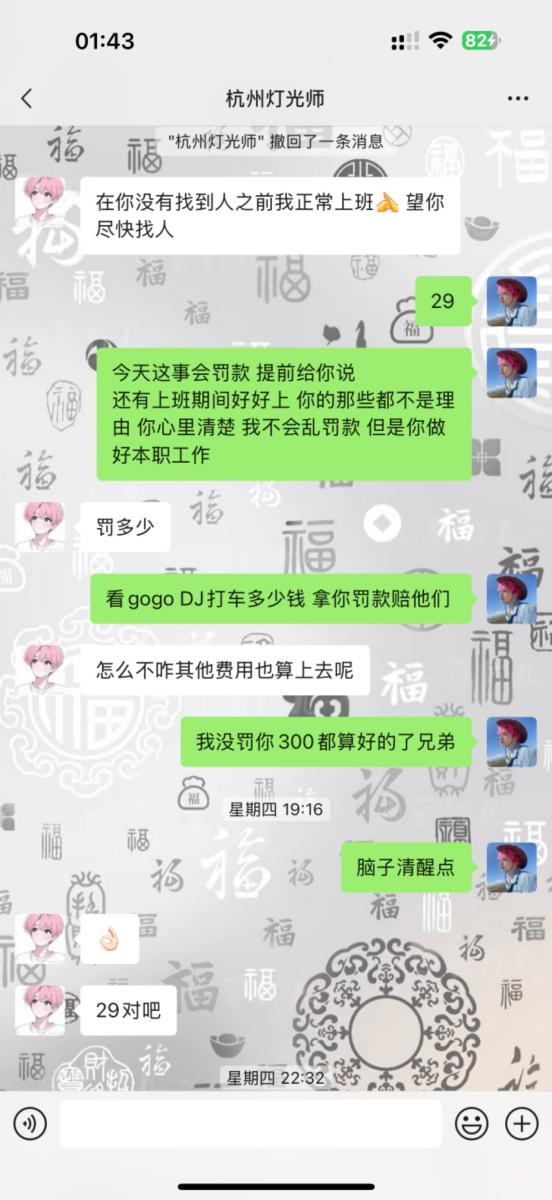 后面实在不行了,我就发信息给他,本着想劝一下他好好上班,然后他说接不下场子今天就走,场子就他一个灯光我以为他要撩场子所以我就说工资没有,后面商量好找到人再走,让他在这期间好好上班避免罚款,前面有罚他款过,金额都在20.30左右,但不是每次都罚,并且补充一句21号我还劝过他好好上班,开会之前就给他说过有什么问题下班后解决的,以下第七张开始是我跟他的截图。