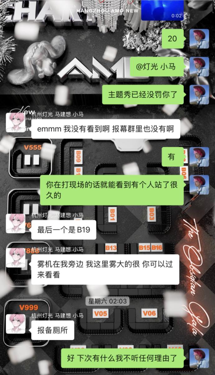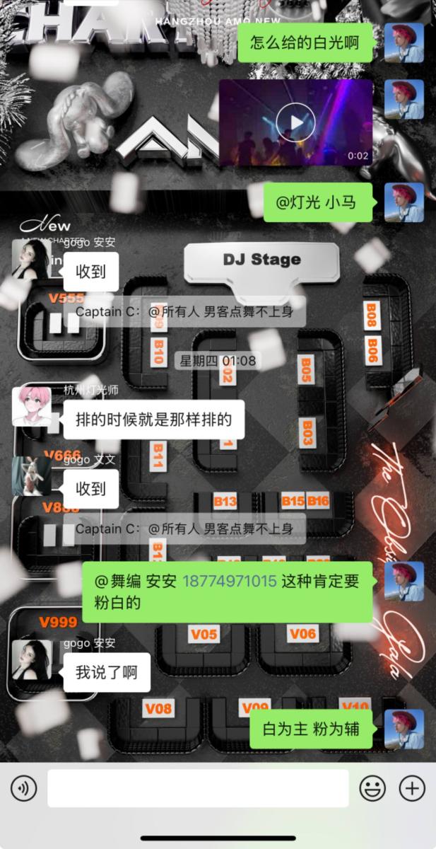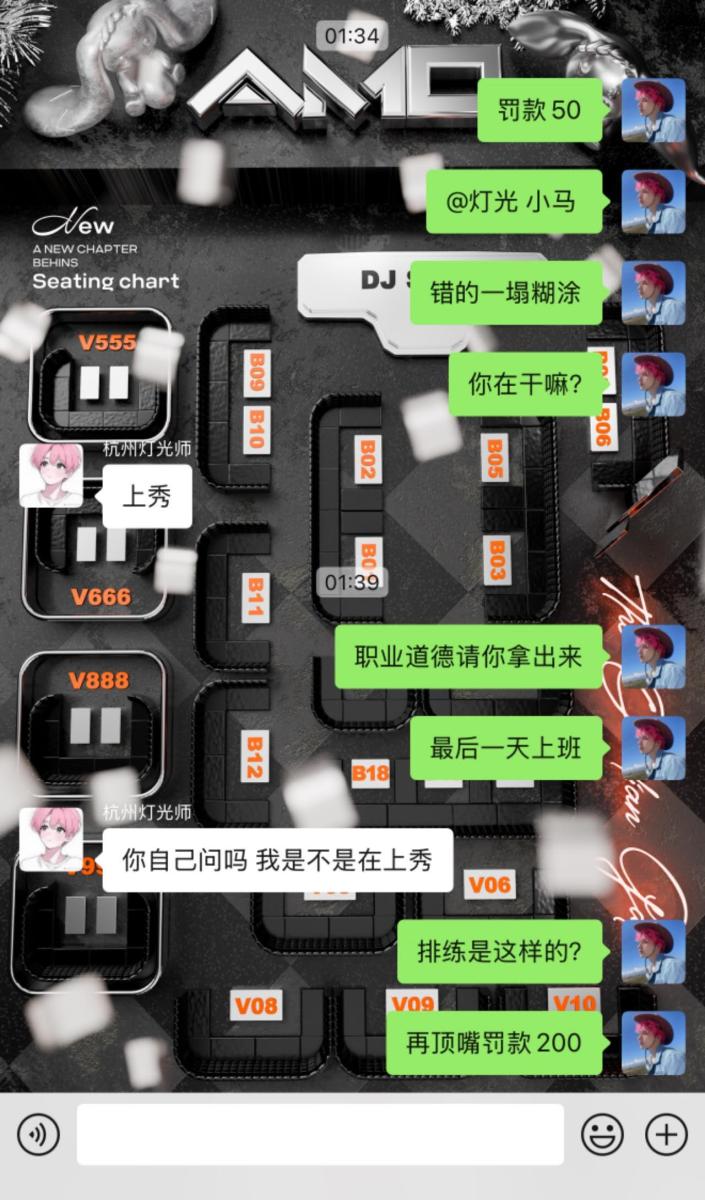 至于他说一开始我没有给他说过灯光秀这回事以下有截图为证据,还有这边的就是舞编去负责,因为她比较全能,我不在有人能看一下现场,我也在群里说过我不在舞编负责,那天舞编罚她是我让罚的,舞编跟我说他又玩手机脱节,我说罚20。