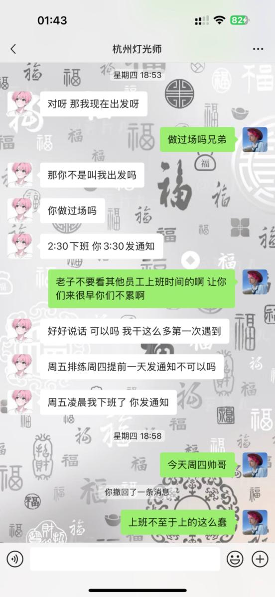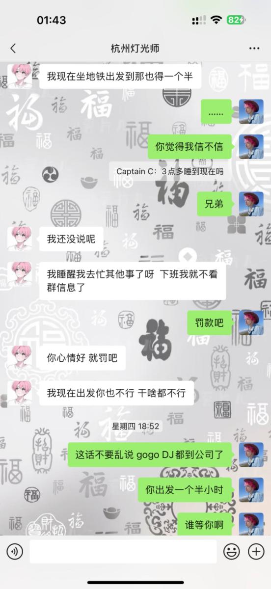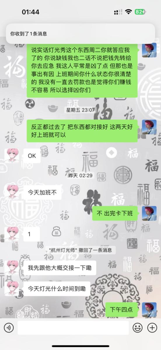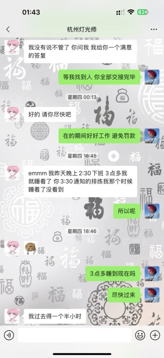 我凌晨3:30通知排练时间,首先我们公司员工当天下班时间点在3:30,我想看他们第二天几点上班然后好根据他们上班时间去定这个排练时间,来早了他们也累,他说他下班回去就睡觉了,那醒来总看得到呀,到排练时间跟我说他刚睡醒,后面又说办事去了,说我心情好就罚,我平时并没有罚他多少钱过,换做任何一个人他的罚款够吃几百上千了,我就给他好好说,这个钱得罚,因为dj gogo 都到了公司,把人家打车费给赔了,就罚100,这个钱我也在群里转给了他们的,他还不服气来一句怎么不把其他的加上,按理来说最少都会罚2.300的,我看他没钱也要走了就只罚他100,说的话真的很让人生气,后面改到第二天排练了。