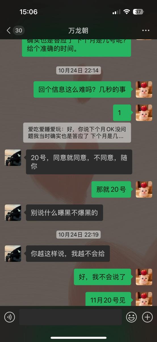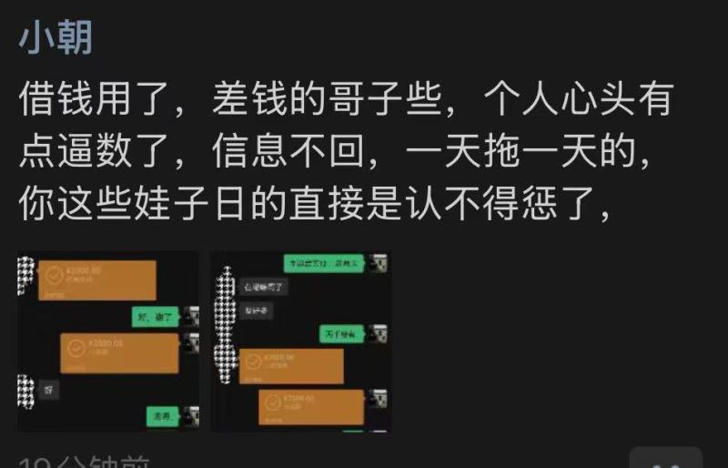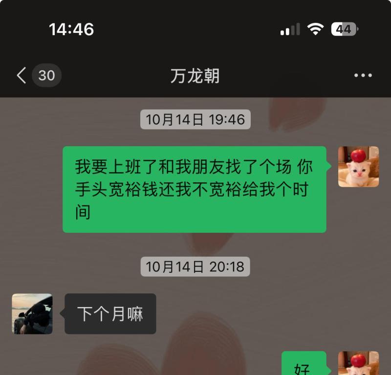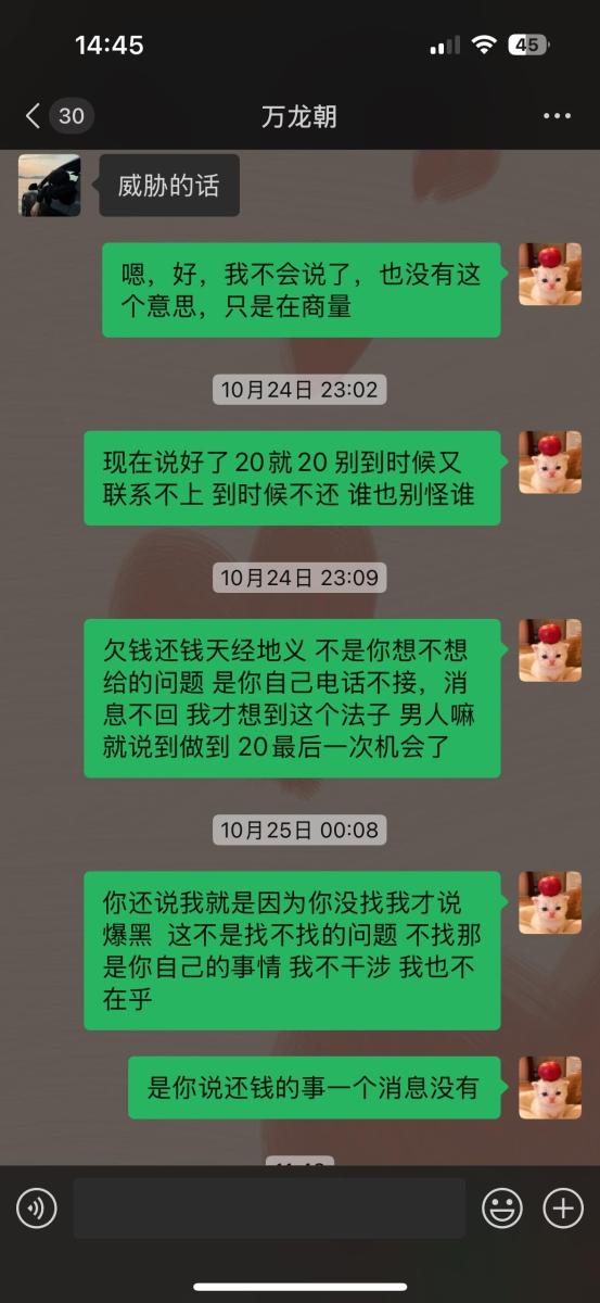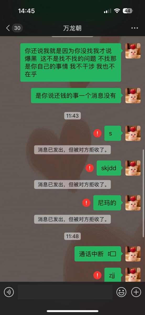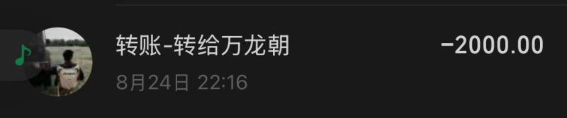 本人24年12.22 去的贵州六盘水柏果镇的AT·ROOM明煌酒吧上班 职位女mc,12.24认识了此酒吧的客人 万龙朝,当天是他的生日,酒吧老板让我过去喝个酒,然后我们加了微信就认识了,这些都是次要的 截止到24年到现在认识快两年没想到都不是人,八月24万龙朝找我借了两千块钱 他当时说的 一周后给我 结果也没给 ,也没给我发信息任何表态,怎么现在欠钱的都这么牛逼吗,后来我就问他,他和我说的11.20给 说的跟真的一样 万龙朝你自己信了没?,结果18号毫无预兆全网拉黑! 根本联系不上,认识快两年的人都不如我家的狗狗、满口谎话 画大饼 嘴里的话没一句真的,有钱去酒吧 ,当时他说的一周后给我,也没给、后来我问 他说他当时有钱当时我不要,没钱了追着问,后来我又给了他时间就是上面信息的11月20号的了,我真笑了 你当时有 不还给我干嘛呢这是啊,是不是太给你脸了 真把自己当个东西,没有一件东西是属于你的,别太把自己当回事