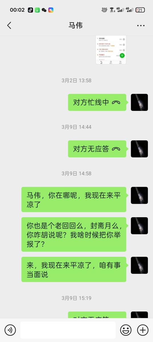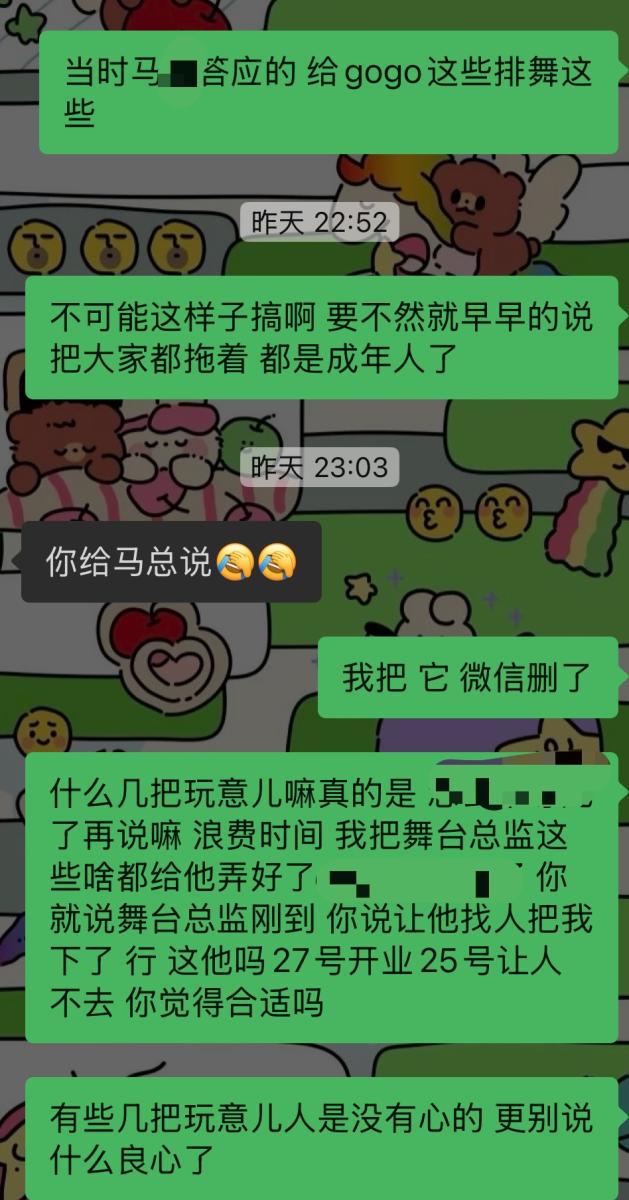 夜场各大同行请避雷 本人于2024.10.11日来到甘肃平凉泾川县ft top酒吧 现在甘肃省平凉市007未来娱乐空间 当时说的12号上班 后面等到16号才正式开始上班 这几天是没有补助和半薪资的 当时我给报的价是1.2后面到手只有9 还是我自己去争取的 然后说给人涨工资让我帮着给gogo排舞一系列的画大饼 后面里面一个老板在群里加了我的微信就是本次的主人公 马某在有家室的情况下 时不时的潜规则 让我一个人去他家喝茶啊 说一些潜规则的话 当然不止我一个 这些大家懂得都懂 这些我就不说了 睡不到人家舞台部的女mc 等人家走了造人家谣 更奇葩的是 现在这个新场子也就是007未来娱乐空间 当时定的是2025年11月11号开业 把第一批舞台部找过来 不给人家半薪 以各种理由下掉人家让人家走 后面又让我找人 我连夜把人给找到 17号18号第二批舞台部到了 说半薪 也是拖到了22号才给人开始发半薪 后面因为店方的一些原因迟迟开不了业 其中很多人都走了 然后暂定是27号开业 ‼️重要的来了 25号晚上告知我 让我先不用去公司 我没多想 后面26号也没人说 我越想越不对 我就去问 结果马某来了一句 我本人先暂时不属于舞台编制内 我只能说666 我忙前忙后去帮你找人 人找到了当天你可以给我说 现在开业前天晚上让人不去 现在翻脸不认人说没有让我找过舞台部 让我去跟店长沟通一系列的事 反正就是人品有问题 同行各大总监老板避雷‼️‼️直接就是把人当日本人整