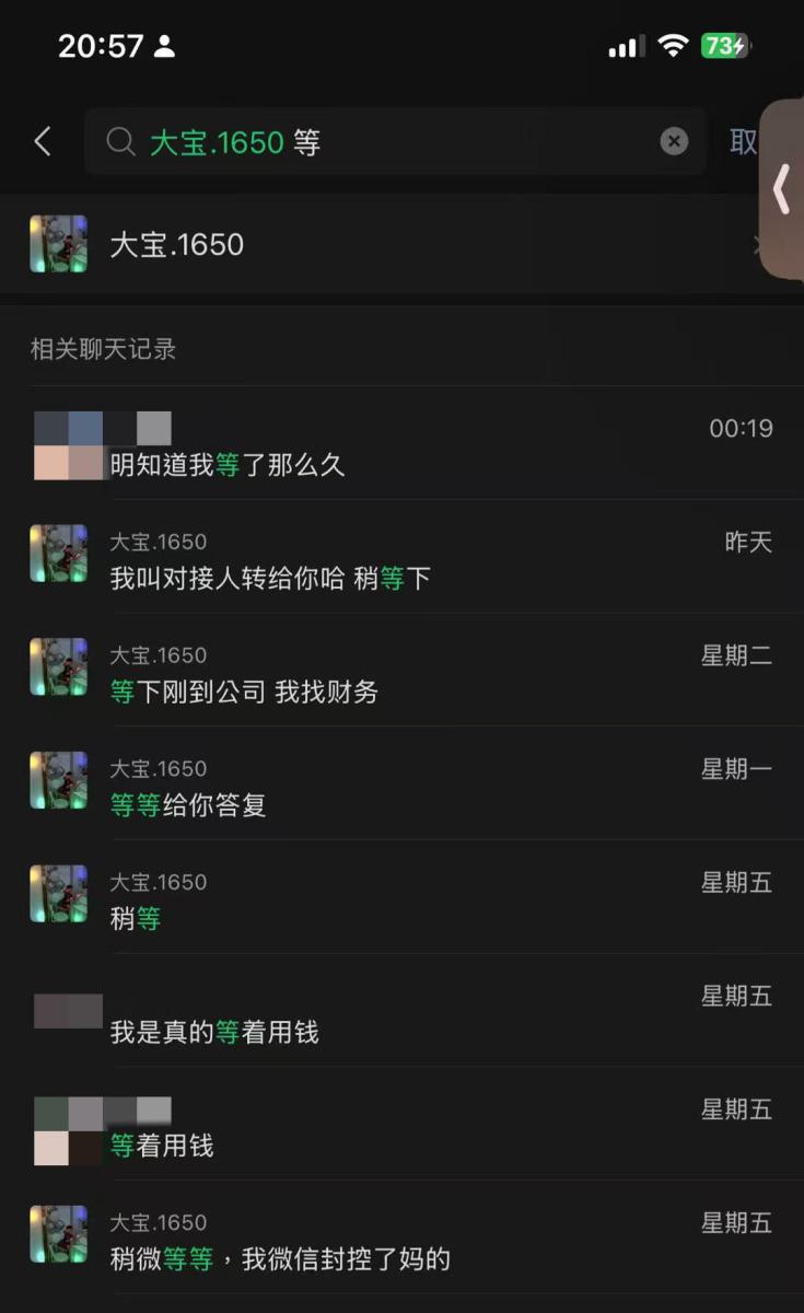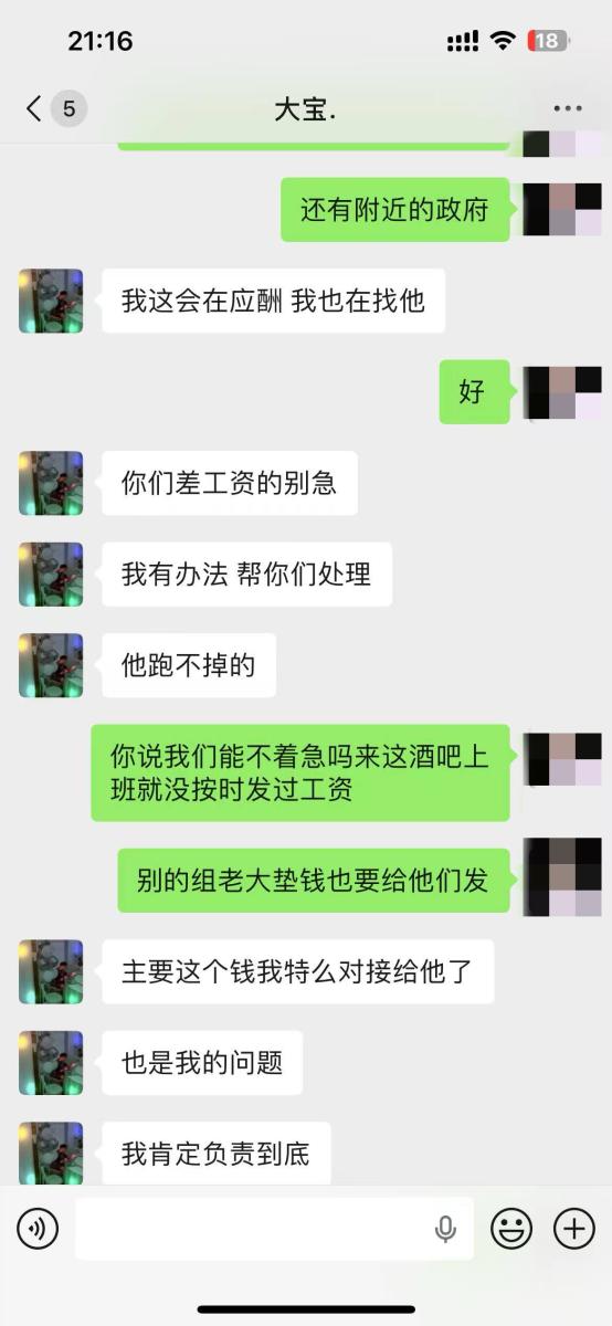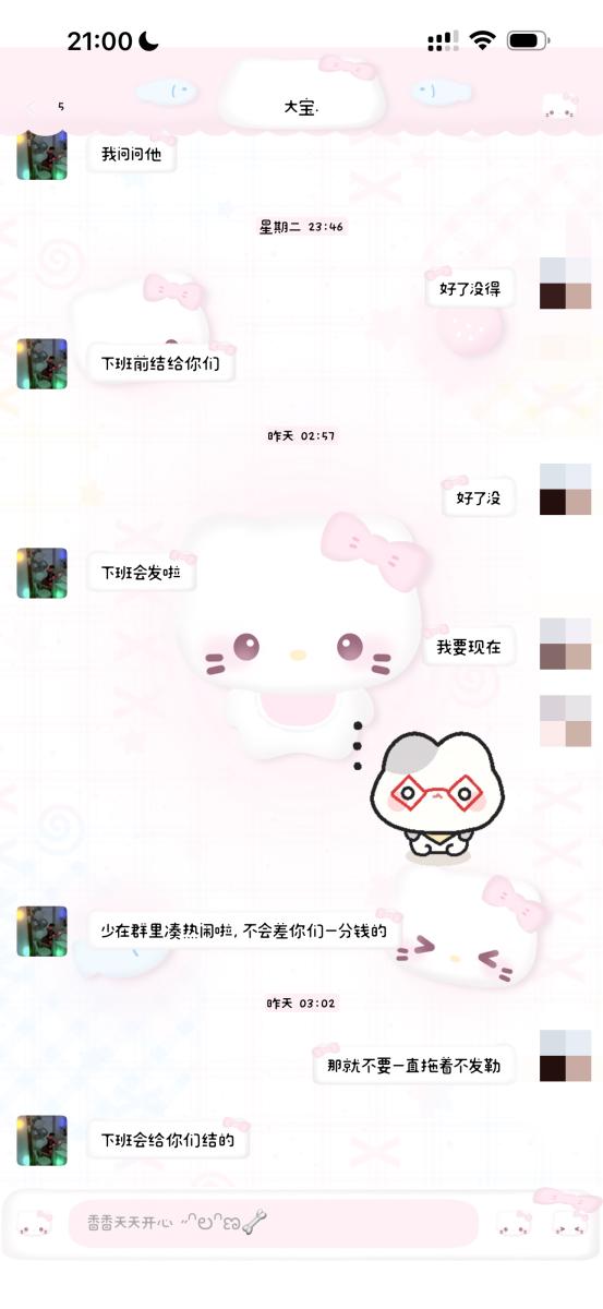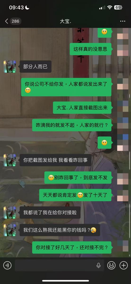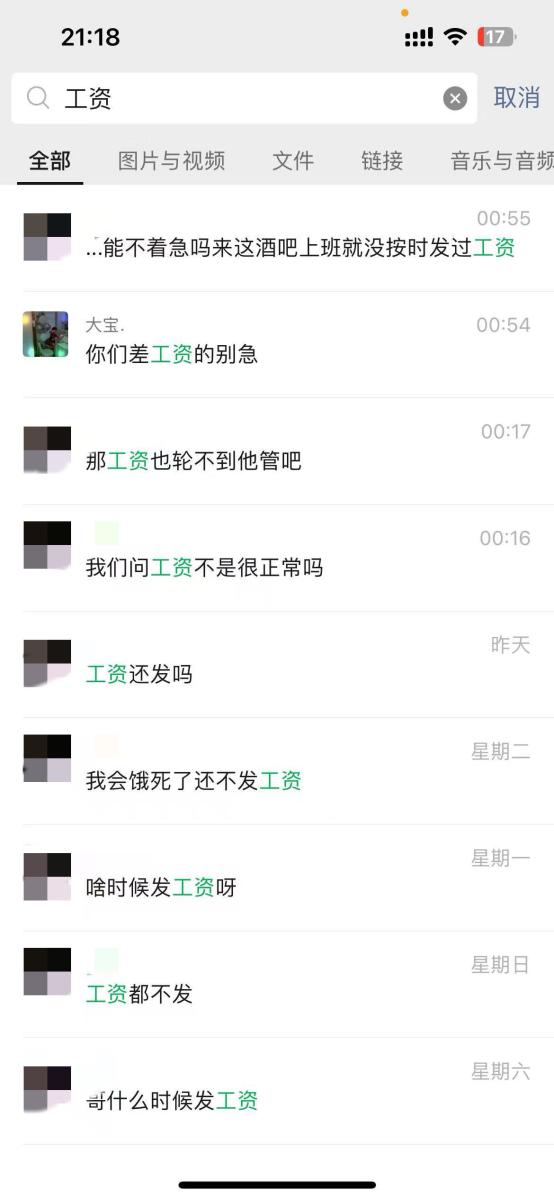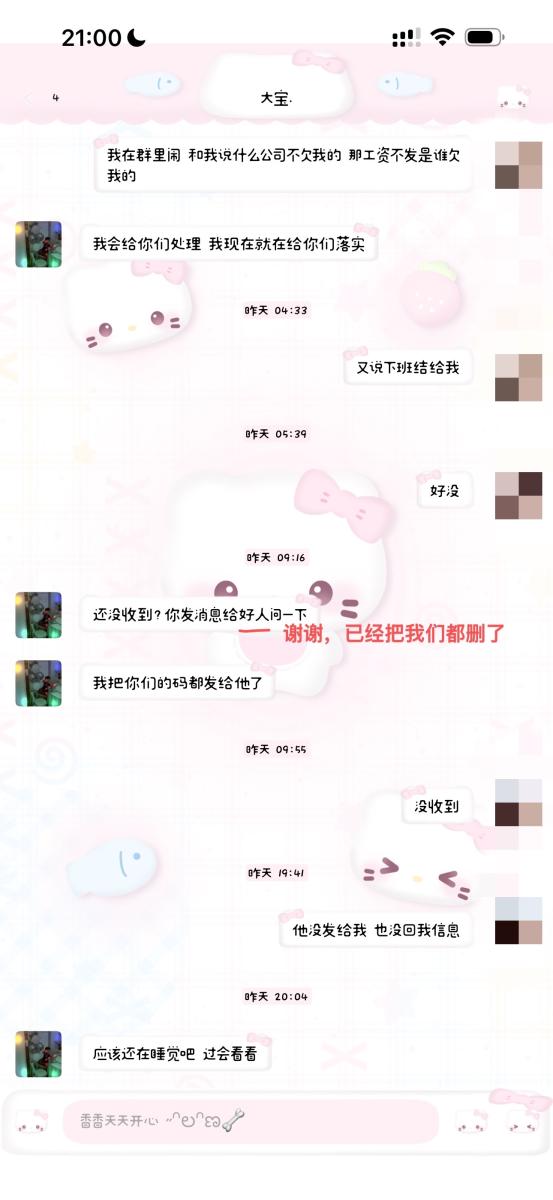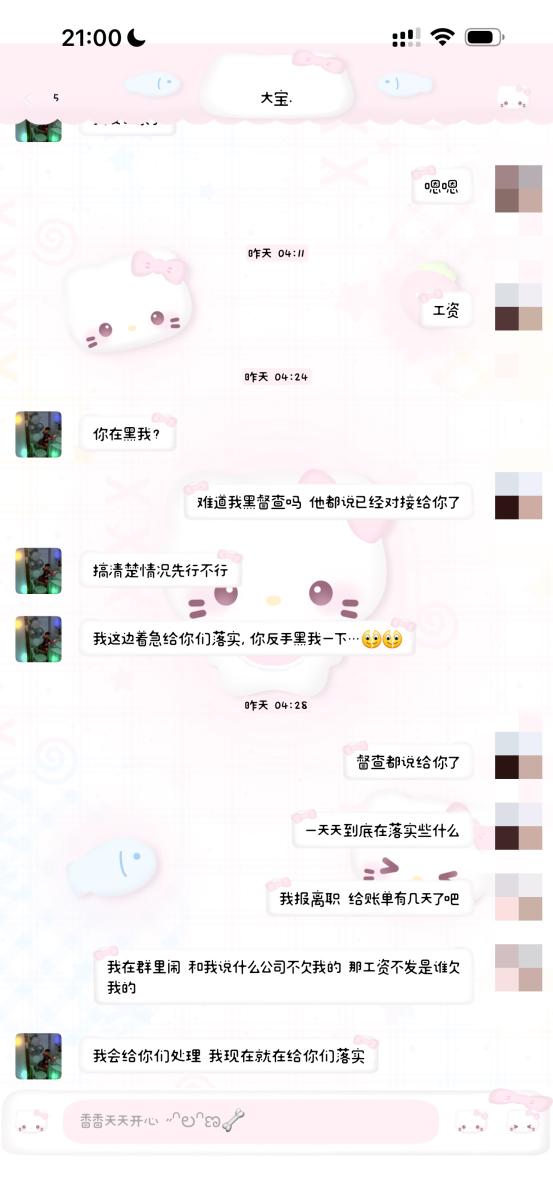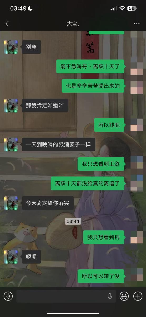 原定说好离职后第二天等督查查完账单发完我工资,那时候已经是拖欠了工资迟迟不结才选择离职,和总监反应工资没到账,总监只是口头上和我说去公司催工资 落实 对接,并没有起到作用。到最后大家只能在群里做着最没用的事情:(在追讨工资),到最后被踢出群。