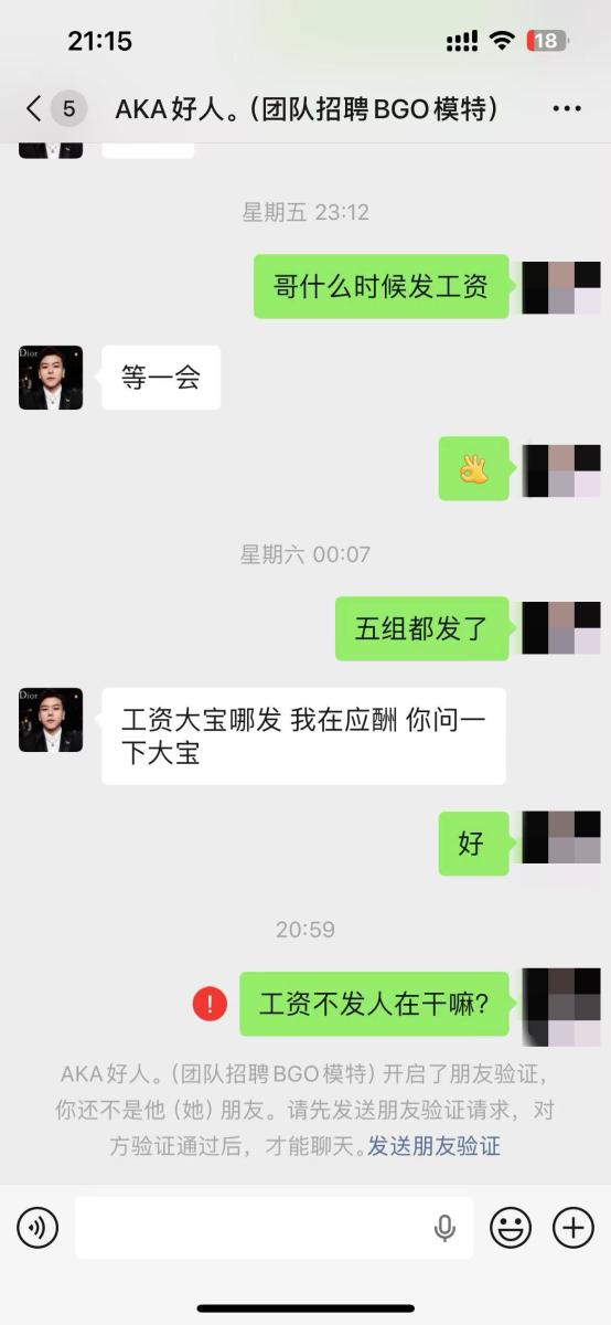 黑人总监发短信很迟不回,队长删除女孩子微信 退出公司群:后面我们得知原来都因恶意拖欠工资被爆黑过。问总监工资到底到账没有,总监声明已把工资发给队长,今日我们得知被队长删除拉黑后,更是得知该队长卷女孩子钱跑路自己花。两兄弟踢来踢去 一个唱黑一个唱白。