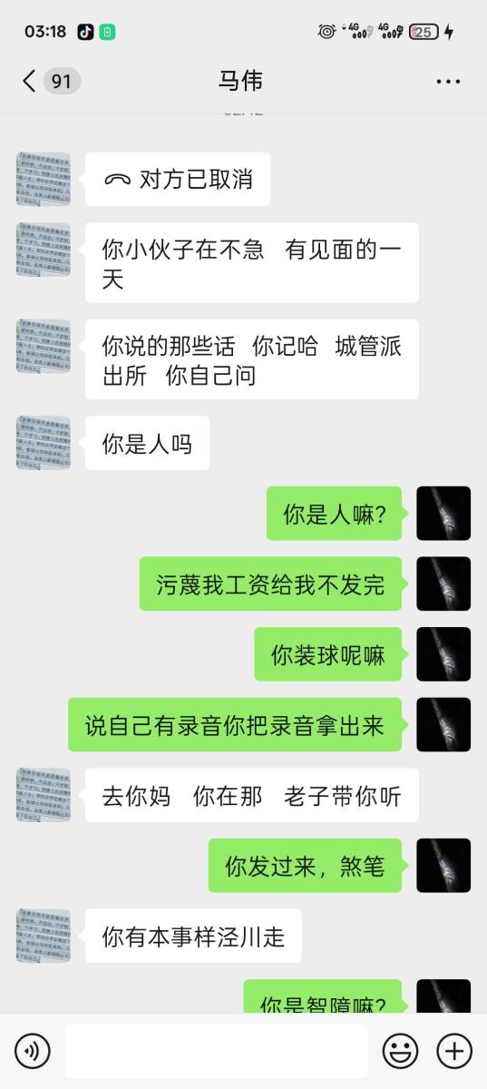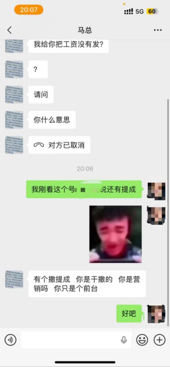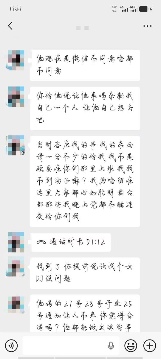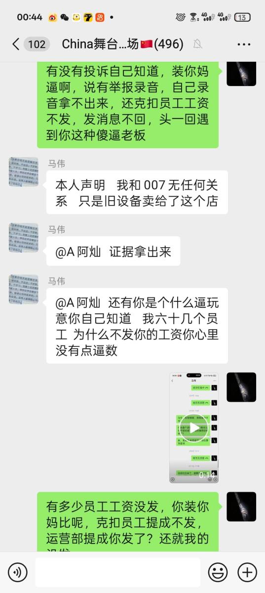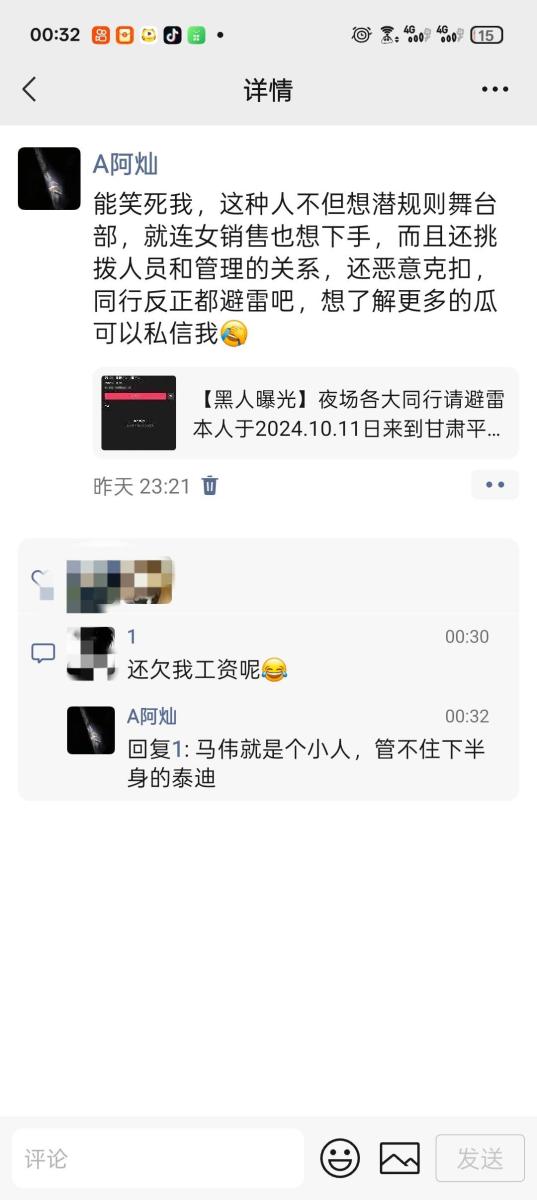 后面大年三十刚过完年那两天因为马某抠搜,不愿打点关系,被政府强制关门停业,然后把事推到我身上,发了两千工资后面工资不给发,说我把店里举报的,说他有录音,后面三千多不给发了,我要录音也给不出来,无耻至极,张嘴说胡话。想哄骗我去泾川找他,我害怕马某给我拉到没有监控的地方一顿暴打,而且言辞犀利,不给人家前台发提成,说前台没有成,那前台的散客提成都装进马某的兜兜咯
