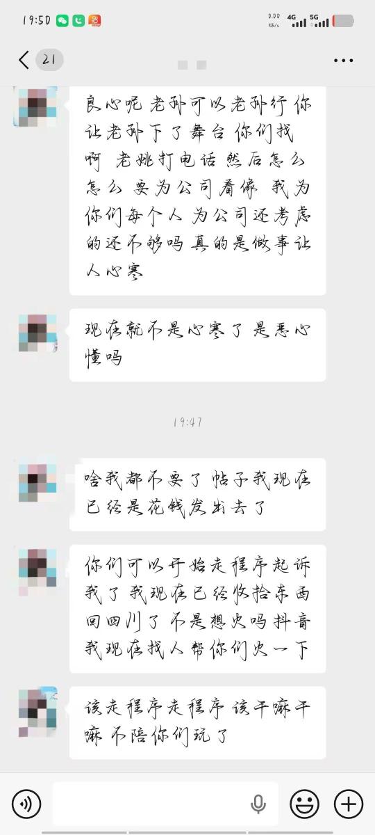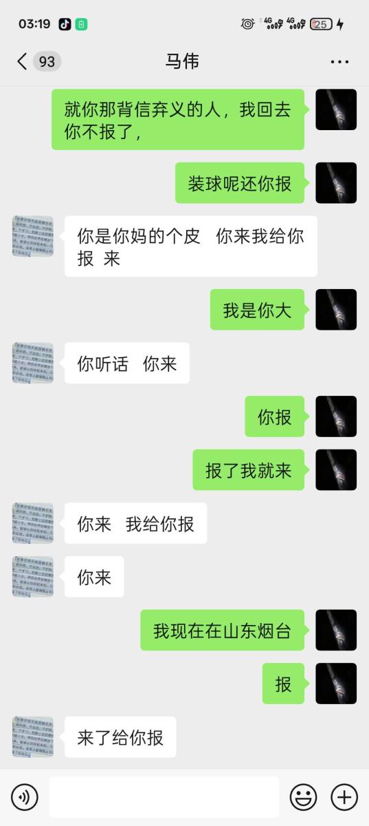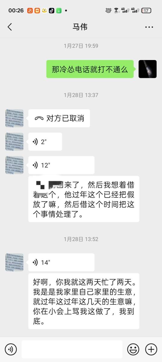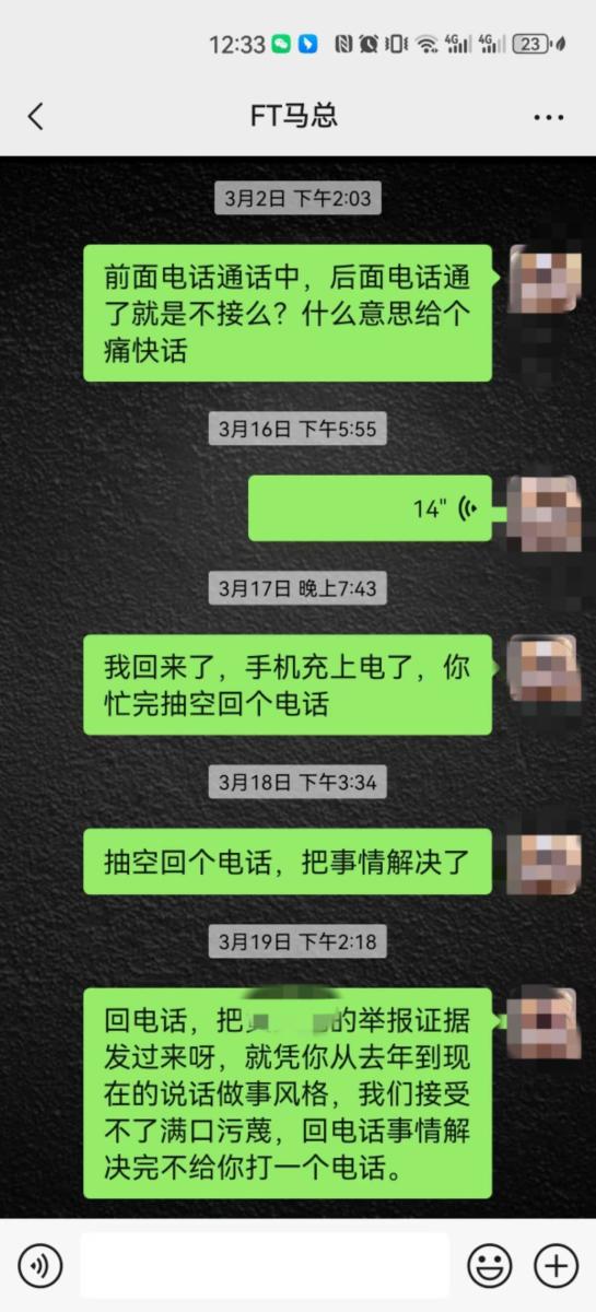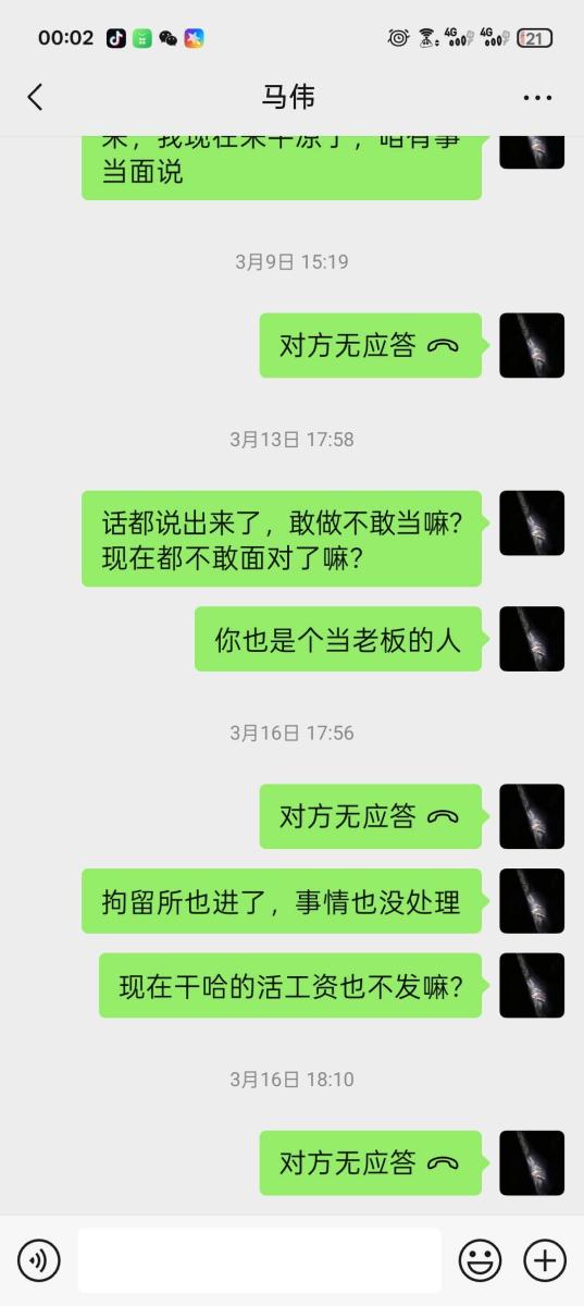 后面大年三十刚过完年那两天因为马某抠搜,不愿打点关系,被政府强制关门停业,然后把事推到我身上,发了两千工资后面工资不给发,说我把店里举报的,说他有录音,后面三千多不给发了,我要录音也给不出来,无耻至极,张嘴说胡话。想哄骗我去泾川找他,我害怕马某给我拉到没有监控的地方一顿暴打,而且言辞犀利,不给人家前台发提成,说前台没有成,那前台的散客提成都装进马某的兜兜咯