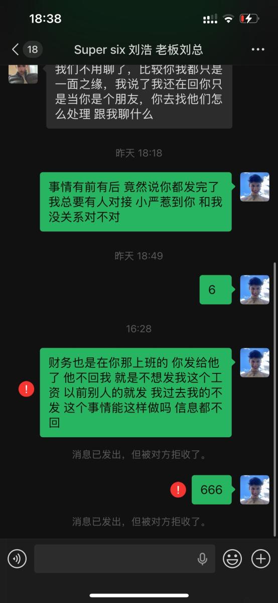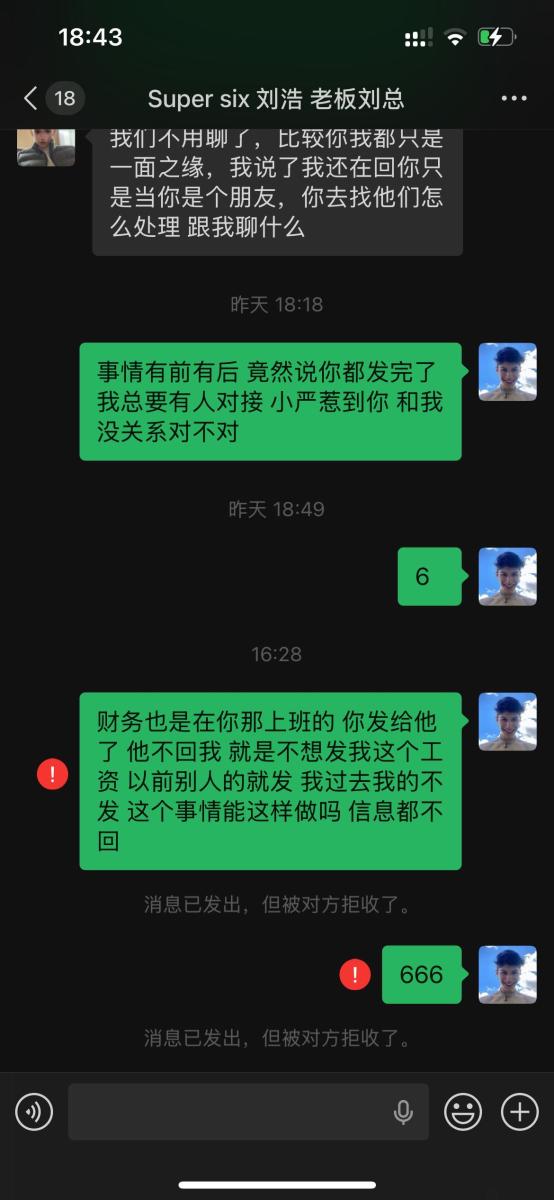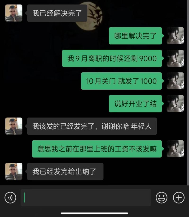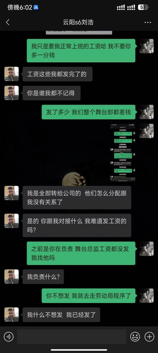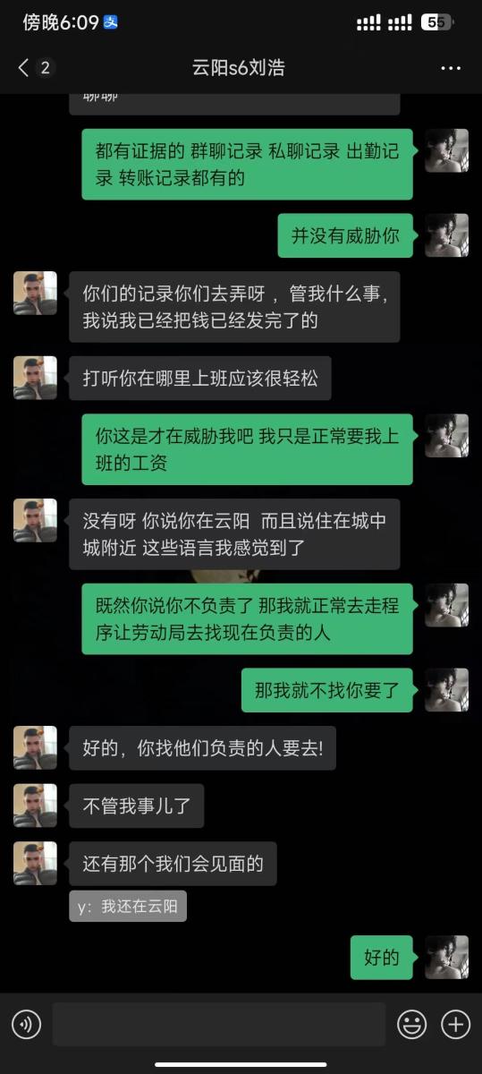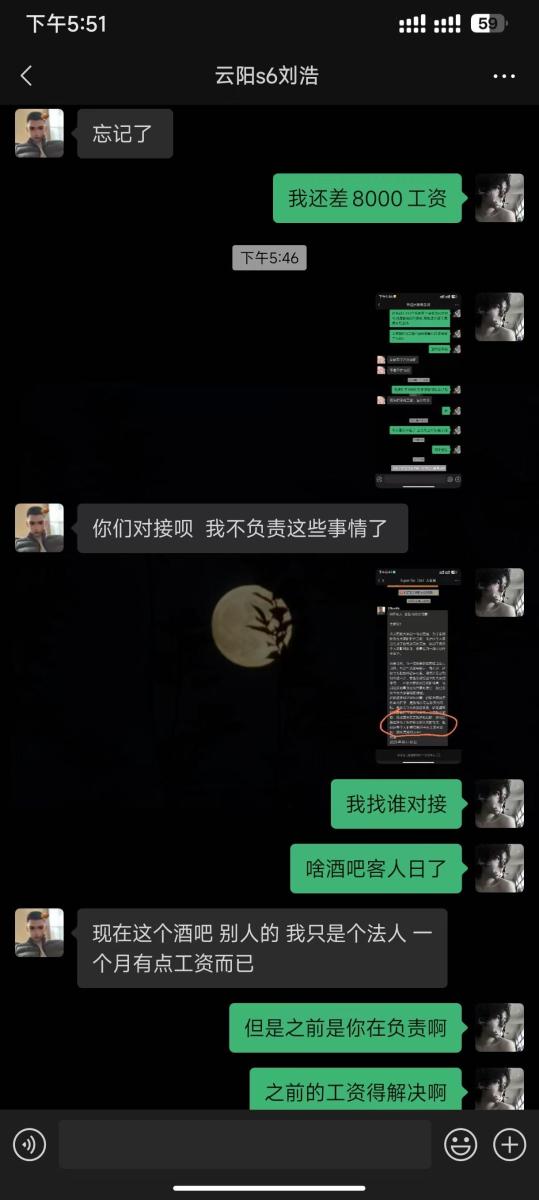 《重庆云阳特大黑场 黑人老板》 天地良心 人心隔肚皮,本人经朋友介绍被叫去重庆云阳s6帮忙 价位1万 8.8日到达 8.9号上班 宿舍惨烈 无奈只得自己租房刚下飞机就拿出来两千块大洋 心凉了一半 无奈对于认识多年好友之信任 说给报销300 这300可是太难给我了 前期正常上班 正常工作 生意时好时坏 公司管理层混乱 员工都是老板手下兄弟 上到第半个月20天左右 舞台同事问我发工资没有我说没有 我说认识的应该拖一天两天没事反正过来帮忙 好家伙😅不问不知道一问吓一跳 舞台部除了我每个人都是有一个多月没发工资了 给我整的直接去问老板(刘浩)什么时候发工资 给我来一句谁没有钱了给预支就好了 哪我心想当前困难能预个一期也好没事 结果一直问天天没有钱 8.9号上班9.3号收到1000块钱预支真的太难了兄弟们 房租一个月一千块 水电费500最少 上下班路远一来一回20块钱这一千块和施舍一样 我过去也不知道花了多少了 两个人的飞机票 租房 打车 更加心寒的是 到9.5号直接说让我休息 好休息了 然后我说休息哪就是下课了 给我结工资就行 他说没有 你说搞笑不 后面因为赚不到钱 拿不到钱 因为人都是需要生活 不可能一棵树吊死 坚持不下去只能走了 走了差不多20天 停业了 10.10号给舞台和全部公司的人发了部分工资 可笑的是我们就收到一千块 对的你没有听错 你没有看错整整1000块!!这是什么概念 含金量极佳啊 一千块我房都租不到 过去帮忙良心喂狗 停业整顿期间我也一直问工作 一直说没有钱 后续听到10.27号开业 当天去问工资 然后就开始踢皮球 说给我们都发完了 当然记录显示发放部分工资来到10.28在问他要工资就说给财务了 财务发朋友圈 不回信息 打电话不接 装看不见 我也不爱骂人 这种人就纯恶心 新过去的舞台兄弟们估计也是要唉黑了重庆云阳县s6酒吧 现已改名s6江南 老板名刘浩 聊天记录太多了 对朋友掏心掏肺 我只问工资事情 其他不管公司名称:云阳县友浩酒吧俱乐部(个体工商户)