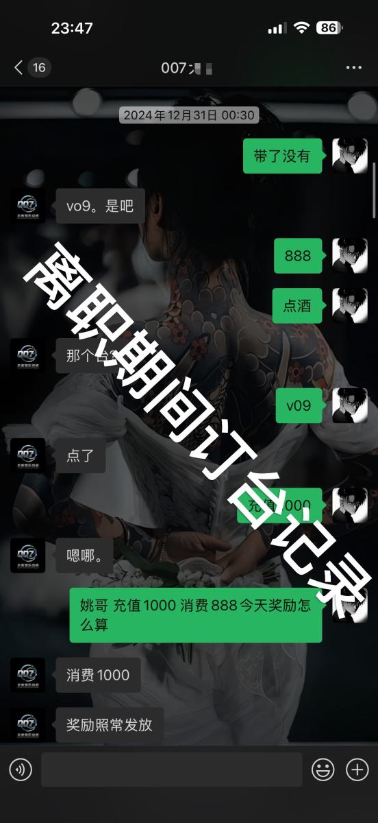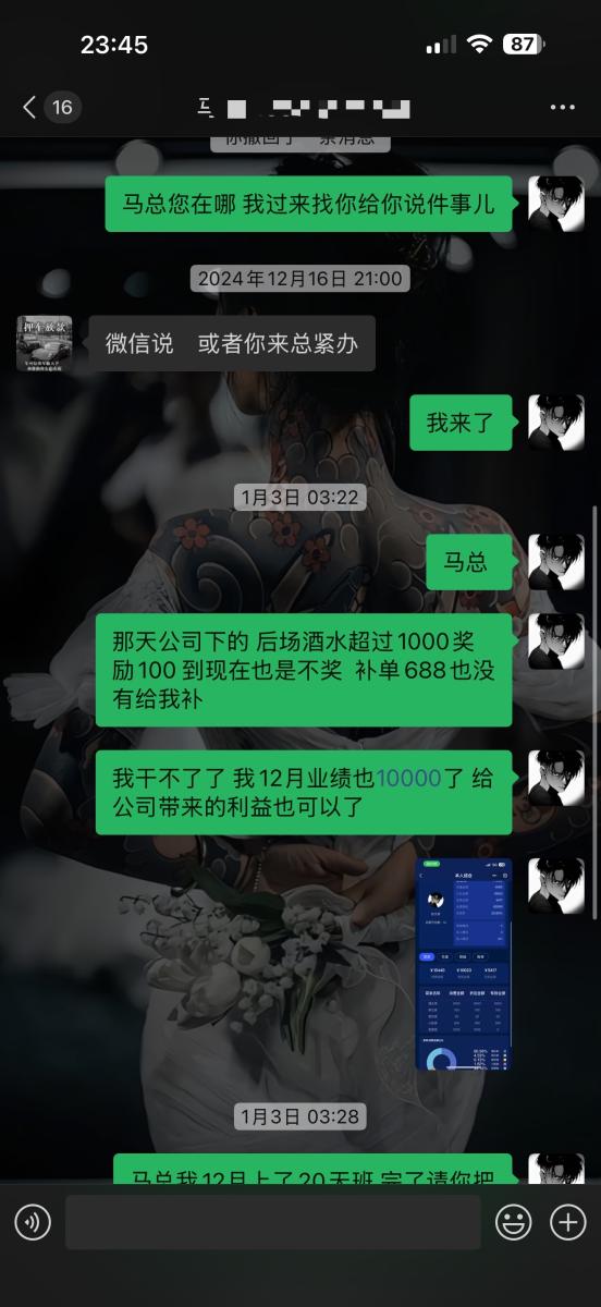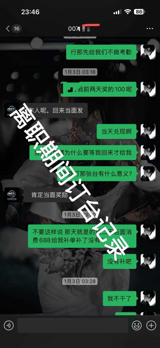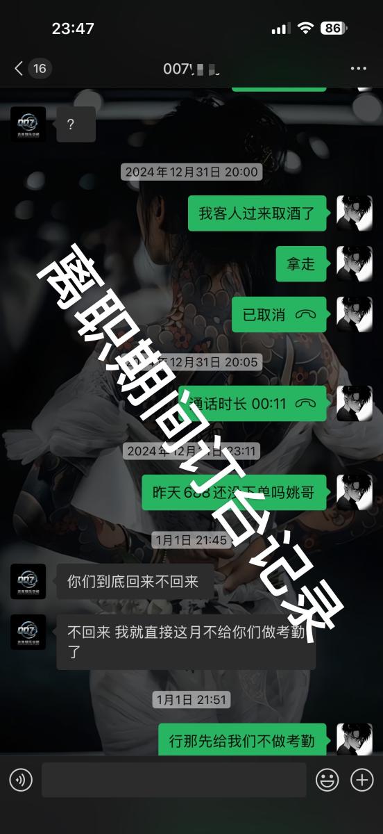 大夜场精英请避雷,本人于2024年九月份任职于甘肃平凉泾川县FT top营销部营销经理 而马某也是FT的老板现在又在平凉市投资了一家酒吧007club我那会儿还是一名在校学生因为身体有事休了长假 在家期间体谅家人的辛苦并在本地酒吧任职营销 而马某也是FT的老板 在工作期间我在店里见了不止一次打架 最严重的一次马某让所有人上去打客人 但还是有一些人没有上包括我在内 我记得清清楚楚把客人拖出去踹到车底下了 后面就找3个人进去顶罪 其中一个是我老大营销总监还有一个是运营部经理黄某还是一个是他的兄弟 在我老大进去的时候我们营销部开始乱了 各种开会说的奖励迟迟不兑现也不认账再加上要回学校我就离职 就不给我批 我没办法就拖着在校期间还一直为公司订台 最后我干了1w的酒水业绩 后面说下次发工资给我发 到现在了也没见过我发过 我去要直接翻脸不认人说跟他没关系甩锅给我老大营销总监 我老大也告诉我会帮我要 难道这么大的老板区区2000块钱工资还要脱一个学生的工资吗我问问良心所在 在这里我奉劝在007的营销兄弟姐妹们一定要注意尤其是女孩子
