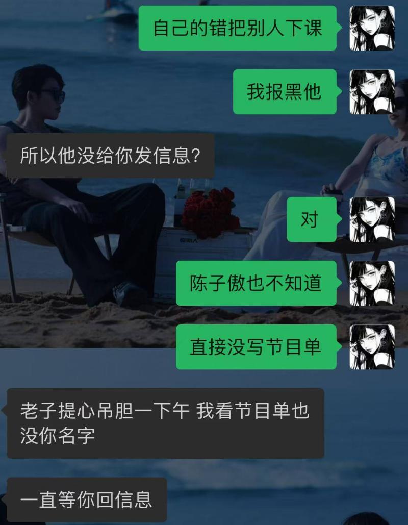 就是前一天叫我对象陪他打游戏,跟我说打到9.30,然后9.27我就让我对象不打了,然后他下班叫我们很多人去吃饭,我们就去了,到了之后一直说我烦,说我拴我对象跟拴狗一样,吃饭过程中一直这样说,还有很多别的难听的话,后面我对象来吃饭地方,他直接跟我对象说下次他俩打游戏,他要给我往嘴里塞大麻,让他俩好好打。我因为毒品这个事情生气了,甩脸走了,然后第2天睡醒,上班发现节目单没有我们了,直接因为这个事情被下课,没有人通知,还是我朋友跟我说的