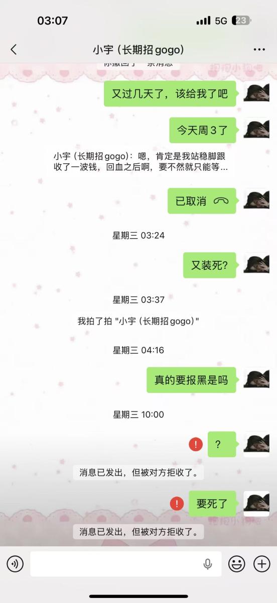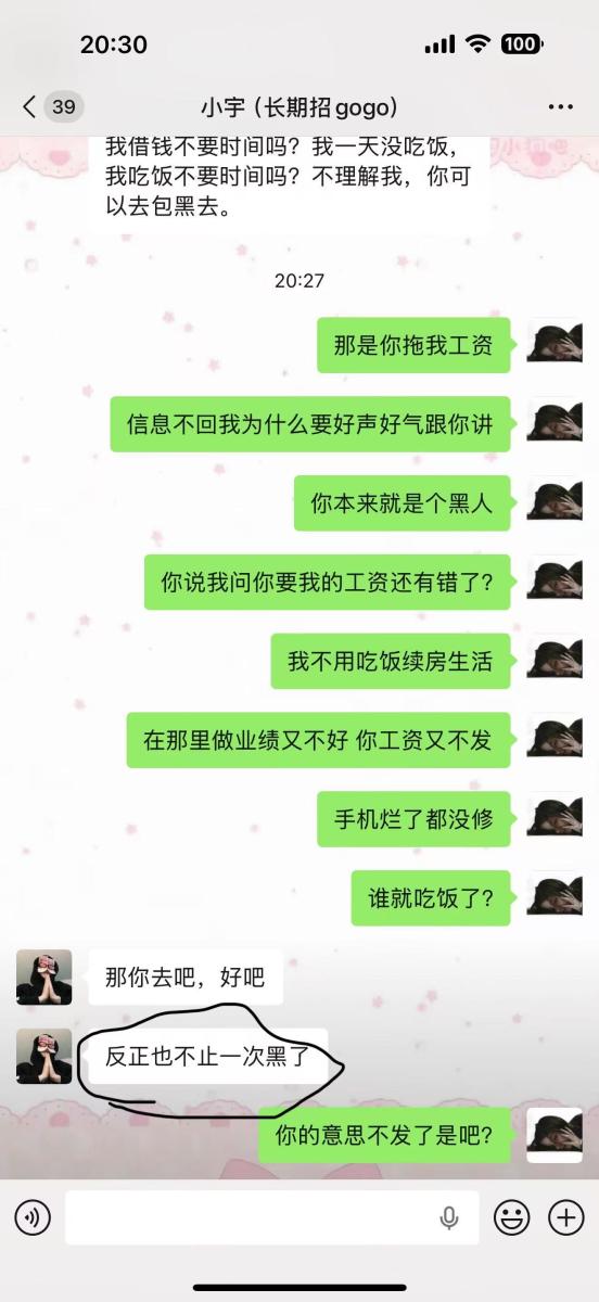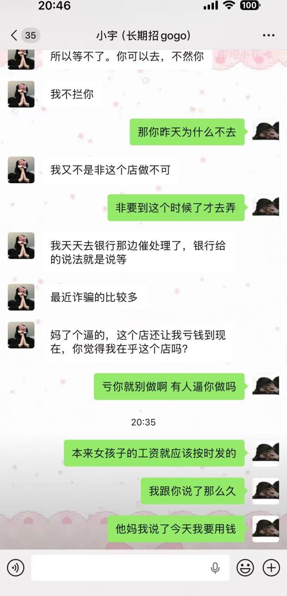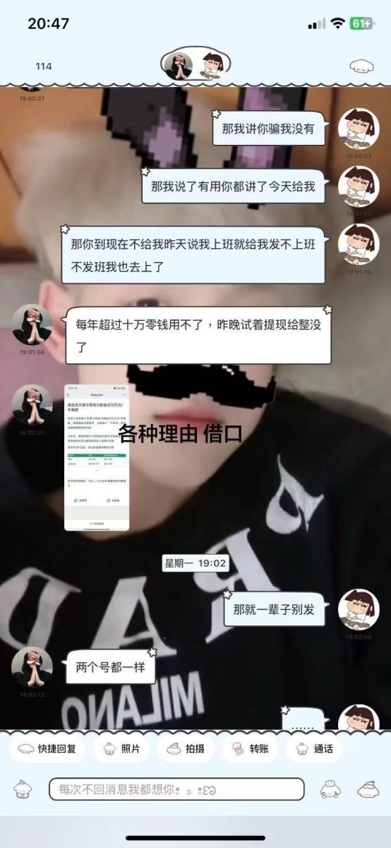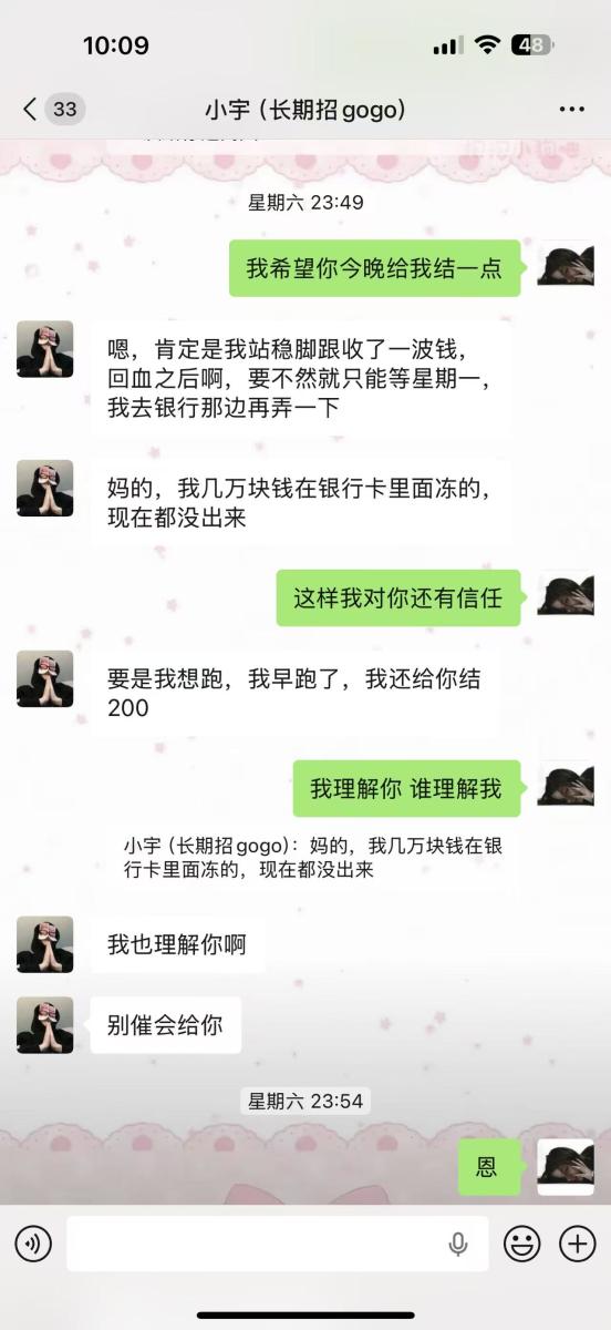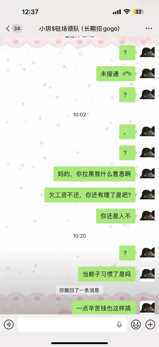 夜场各位同行女孩子请避雷 一个带队的经济,外号康康,真实名字:庞师宙!他本人有6个微信号小宇 康康经常发经济群招女孩,说好工资日结不押,后面一直已各总理由说银行卡限额 什么的发不了工资,他老说银行卡限额确每天让队长发我们的工资给他,他再发给我们,那我请问一下限额的话你直接让队长给我们结工资就好了,你为什么一直让队长给你发钱,你却不给我们结工资呢,11.28号的工资12.6号问询无果把我们拉黑,一直说工资会结,结果确是拉黑,我们女孩辛苦喝酒赚来的钱你不给我们发工资,一直骗我们上班!此人目前两个微信号 K-02168 jiuyue1911571