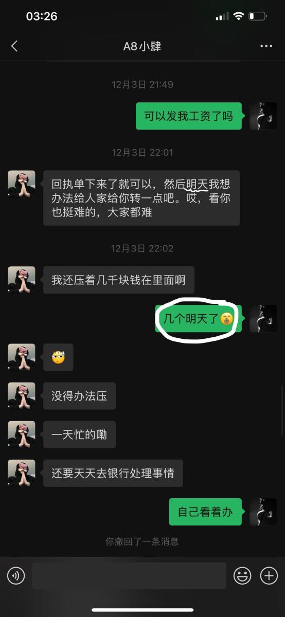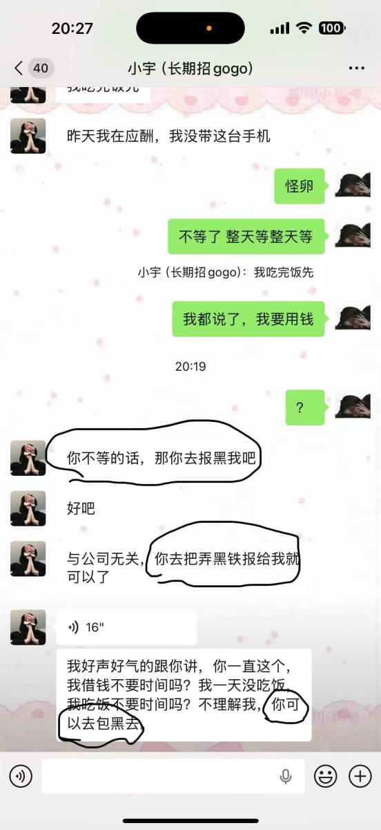 夜场各位同行女孩子请避雷 一个带队的经济,外号康康,真实名字:庞师宙!他本人有6个微信号小宇 康康经常发经济群招女孩,说好工资日结不押,后面一直已各总理由说银行卡限额 什么的发不了工资,他老说银行卡限额确每天让队长发我们的工资给他,他再发给我们,那我请问一下限额的话你直接让队长给我们结工资就好了,你为什么一直让队长给你发钱,你却不给我们结工资呢,11.28号的工资12.6号问询无果把我们拉黑,一直说工资会结,结果确是拉黑,我们女孩辛苦喝酒赚来的钱你不给我们发工资,一直骗我们上班!此人目前两个微信号 K-02168 jiuyue1911571