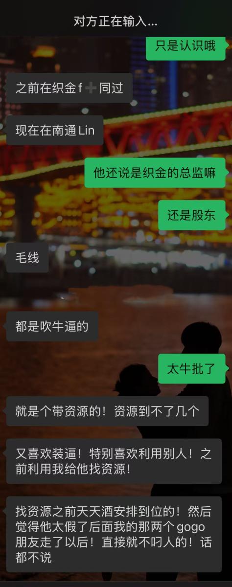 还自称自己是织金那个场子的股东 我觉得也是假的 嘴里没一句是真话 一会儿说自己是总监 一会儿又是股东 老子看你是没有钱用的太监