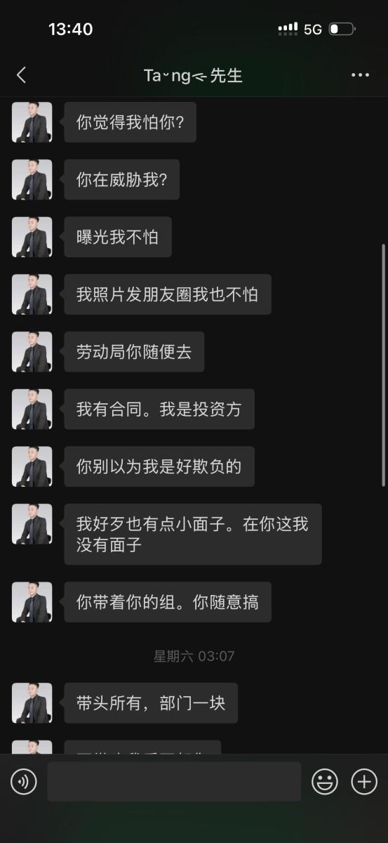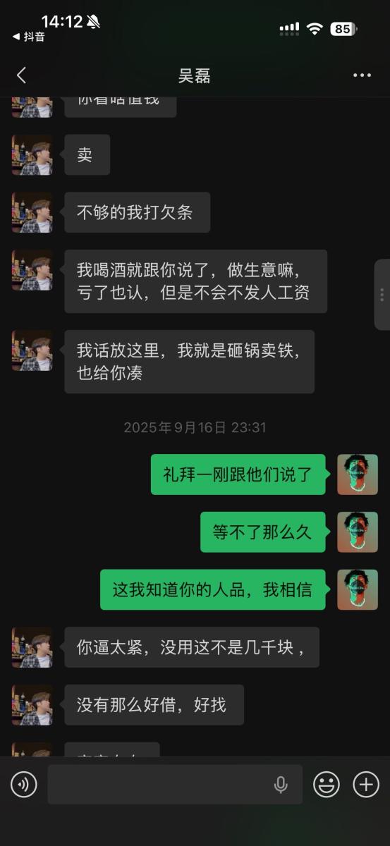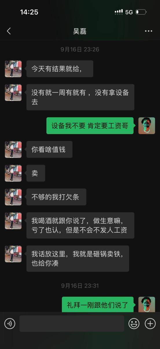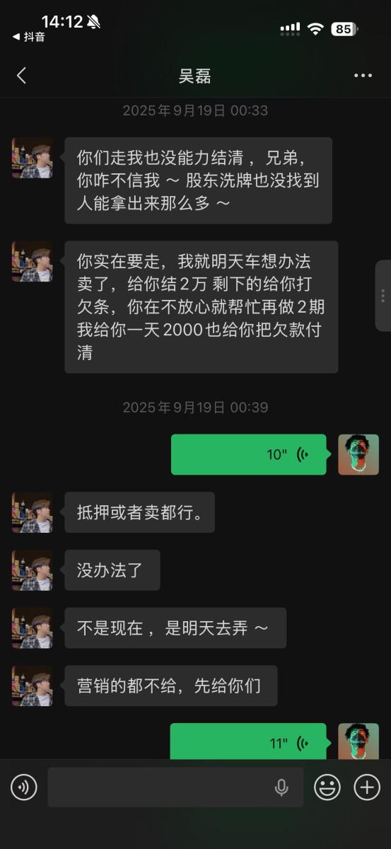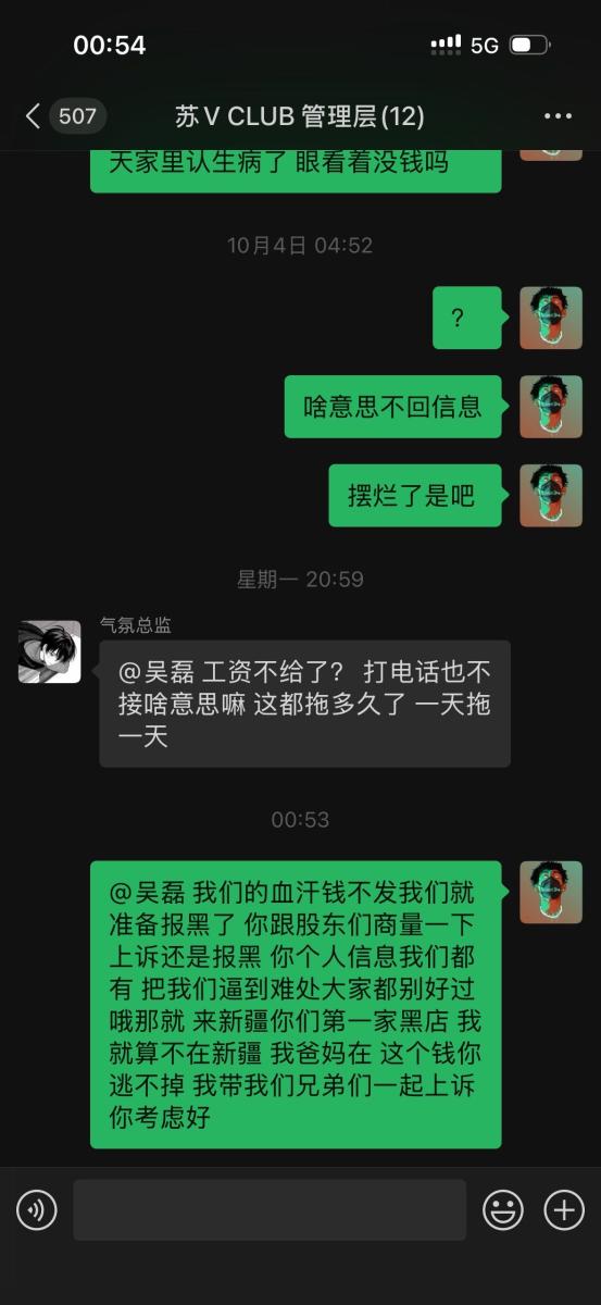 讨债经过:从2025年9月初一直讨要工资至今 因为9月15停业一直未开业店方给予承诺开业后跨年结束结 一问就是账上没钱(说来也可笑 有钱请擦b嘉宾 没钱结工资啊)在职法人吴磊(真名:孙元洲)一直跟女股东范总踢皮球至今为止发消息都不回了在讨薪期间 其中一股东唐林对舞台总监进行社会威胁 (你是阿克苏dao qiang 炮嘛这么厉害 一个二手保时捷车主 还是抵押的)顺便在补充一句我们的大店长你很优秀还是业务很好啊 管理能力差就算了 要工资都要不到 李轩李总(真名:骆学龙)
