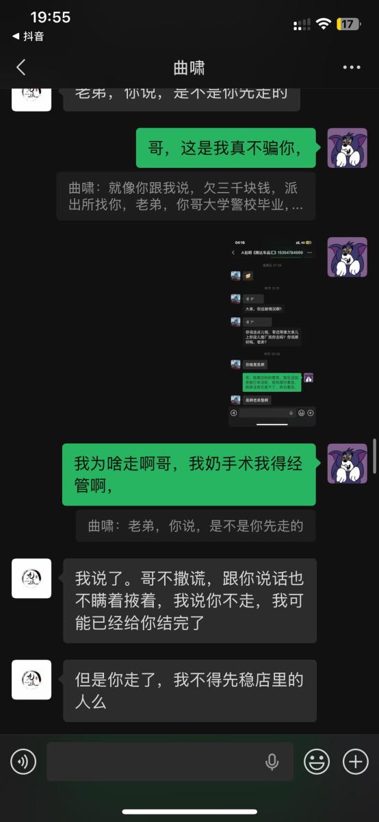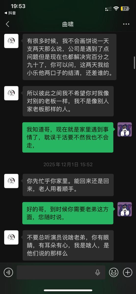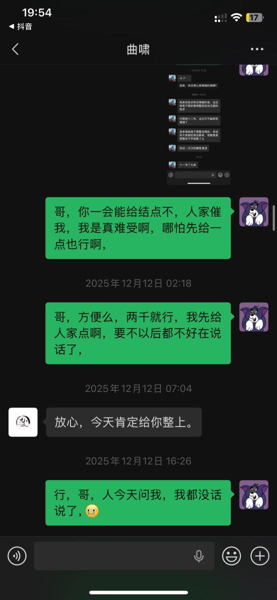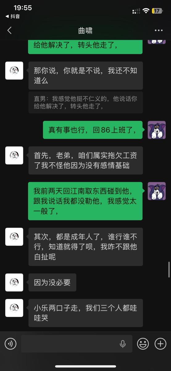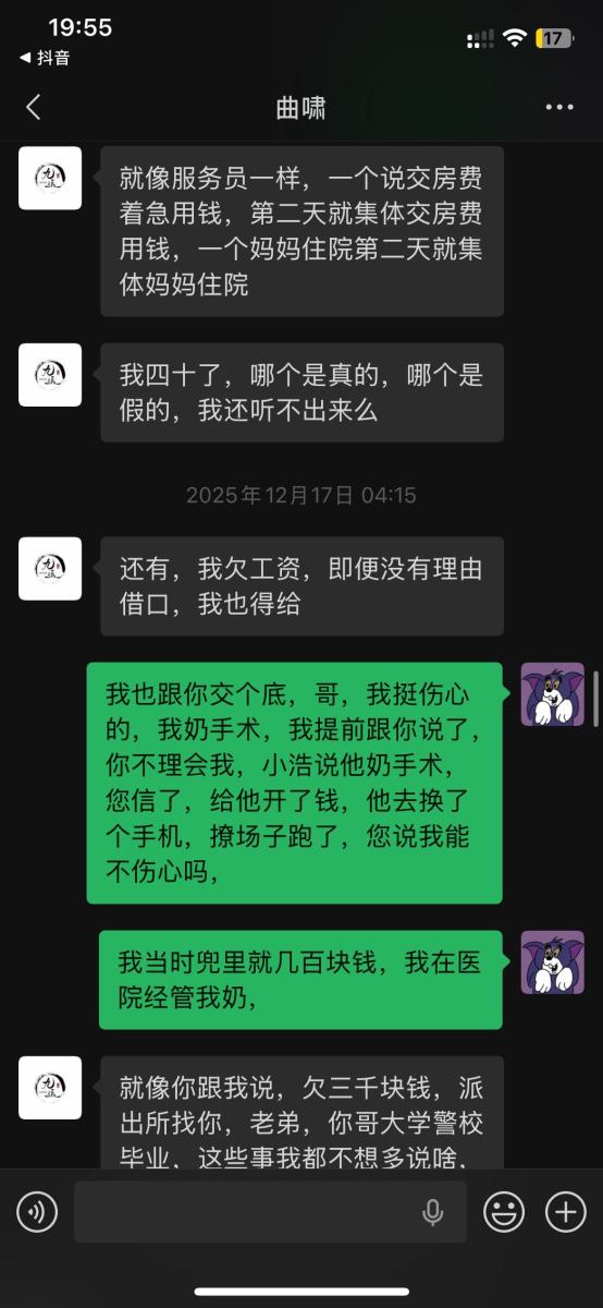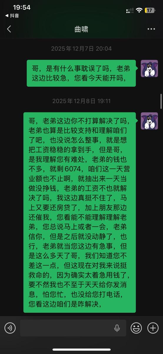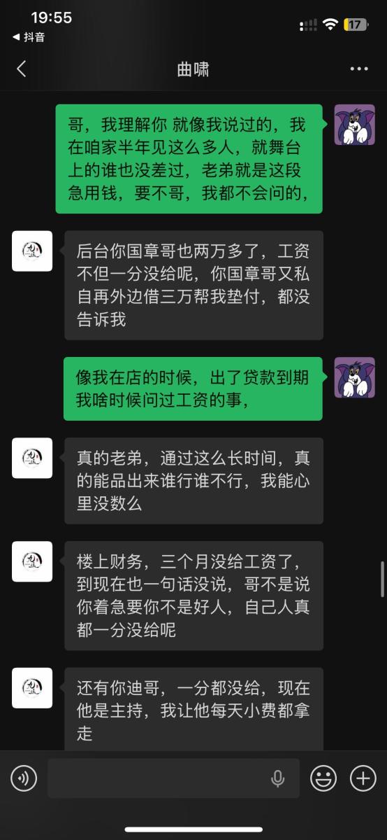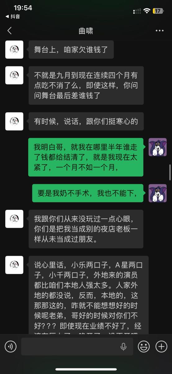 本人于2025年5月入职吉林省松原市九运星橙酒吧,担任VJ一职工资压五结十,刚去的时候老板对我们都非常不错,工资准时,日常聚餐,从第二个月开始展露工资每次都拖1-2天,我们想着就一两天也没什么事情,可是越来越过分,从1-2天演变成5-8天,再到一期压一期,最长1个月没开出来一点工资,找他就是各种理由,本人在下边的截图是离职后的对话,在职期间本人房贷到期找到老板,其均口头答应开工资,并为付出实际行动,在看透老板为人后于2025年11月4日选择离职,但是店方并为找人,一直拖着我,由于本人家里特殊情况(我奶住院了)选择于26日找一位本地替班,(他与店方谈工资日结)本人离开店方,后期多次与其进行沟通均无效果,我说我奶住院我需要用钱,先支付工资2000,也仅是口头答应,多日软磨硬泡支付1000元,后期本人欠朋友三千元到期还钱,我去找老板多次沟通未果,发现我朋友对象是老板的同学,我就让他们去找老板沟通,终于帮我还款3000元,先剩余工资3074,但是联系不上老板,发微信也不回,先只能借助平台发酵只为讨回工资,并给广大夜场同僚作以警示,(并不只欠我的,目前在职人员全部拖欠工资,离职人员大部分未结清,结清的也是个各凭手段,包括报警,去场子拉音乐)