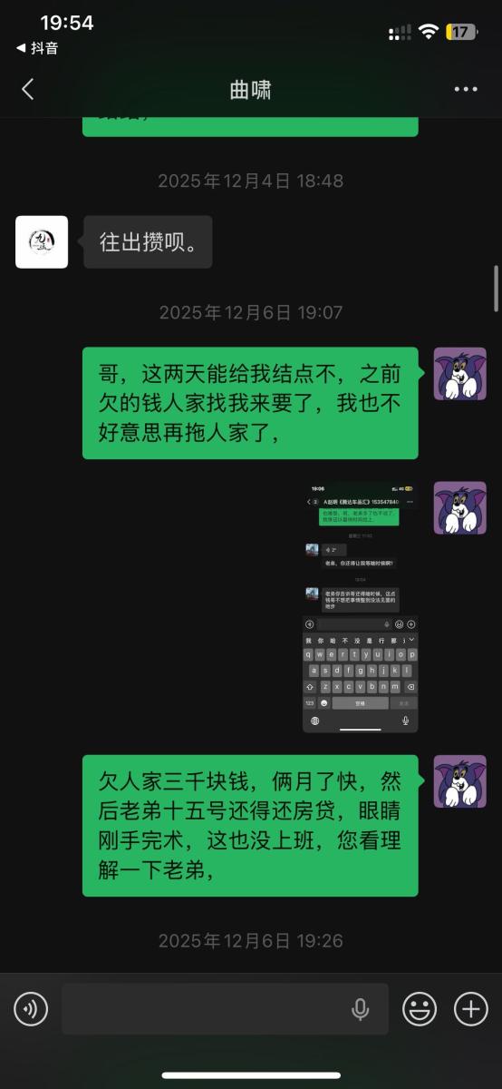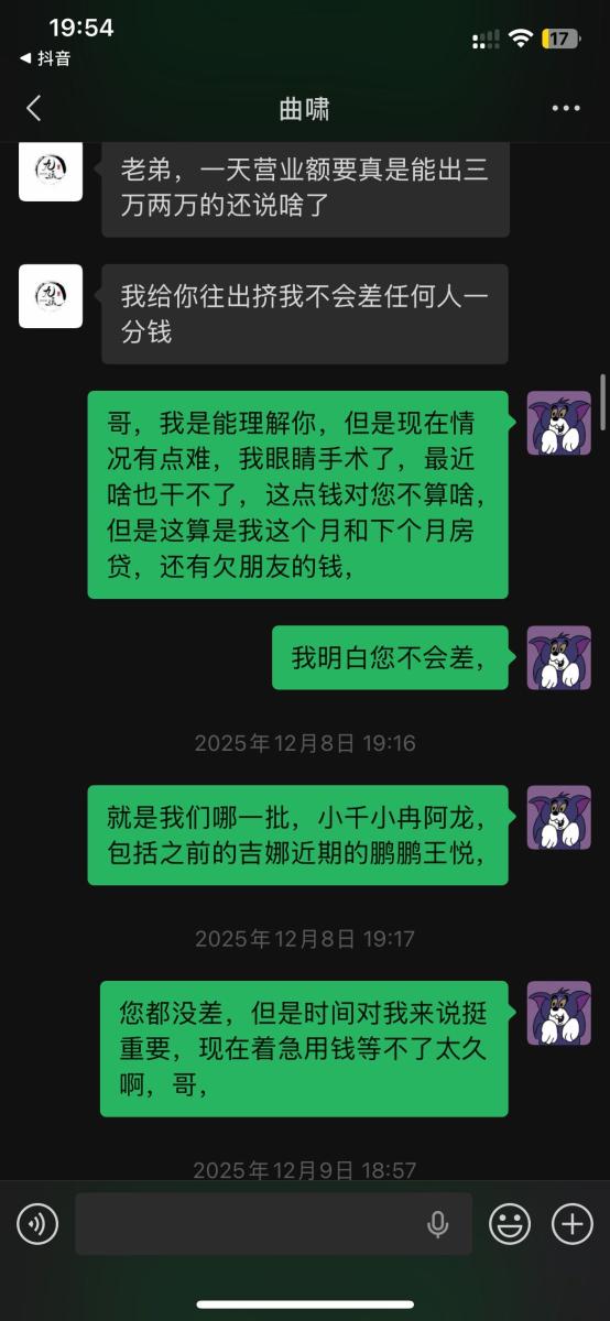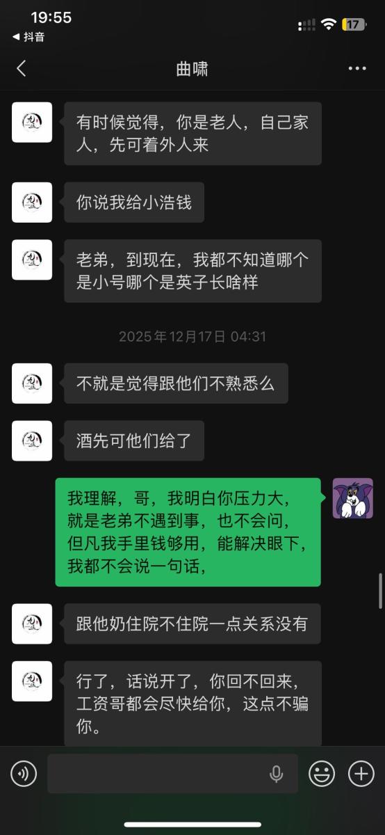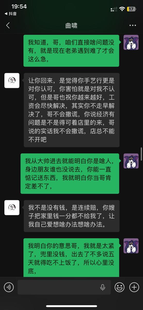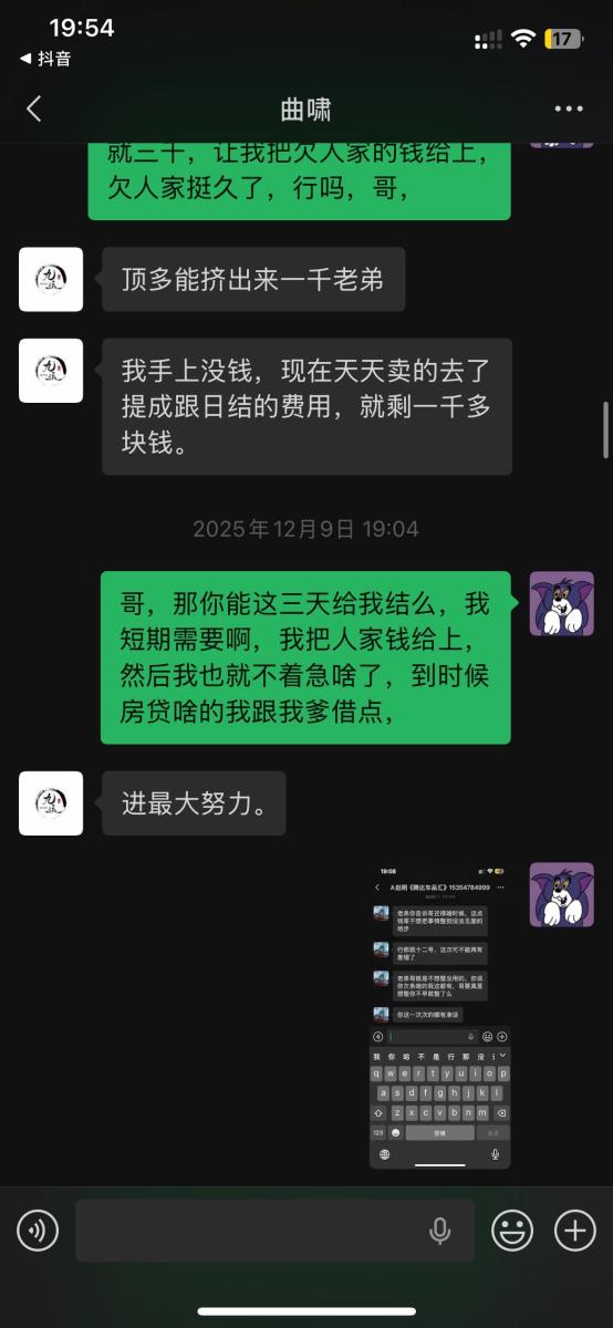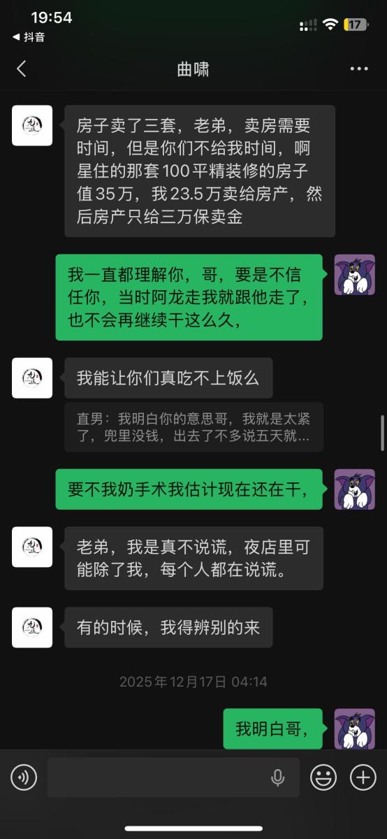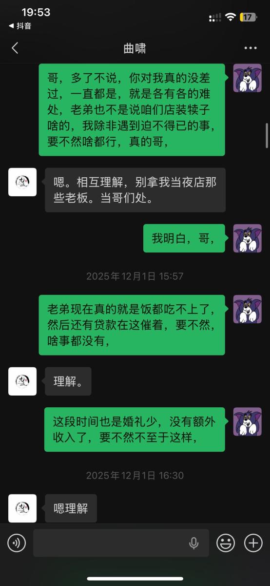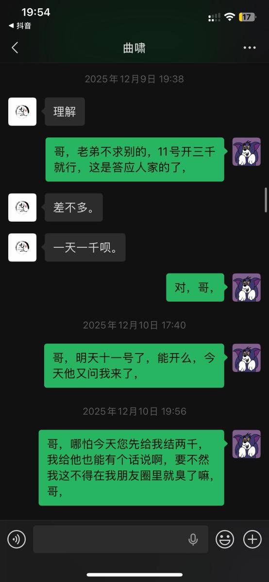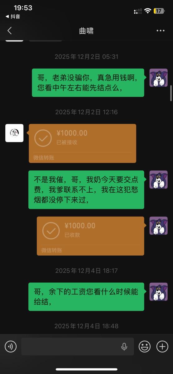 本人于2025年5月入职吉林省松原市九运星橙酒吧,担任VJ一职工资压五结十,刚去的时候老板对我们都非常不错,工资准时,日常聚餐,从第二个月开始展露工资每次都拖1-2天,我们想着就一两天也没什么事情,可是越来越过分,从1-2天演变成5-8天,再到一期压一期,最长1个月没开出来一点工资,找他就是各种理由,本人在下边的截图是离职后的对话,在职期间本人房贷到期找到老板,其均口头答应开工资,并为付出实际行动,在看透老板为人后于2025年11月4日选择离职,但是店方并为找人,一直拖着我,由于本人家里特殊情况(我奶住院了)选择于26日找一位本地替班,(他与店方谈工资日结)本人离开店方,后期多次与其进行沟通均无效果,我说我奶住院我需要用钱,先支付工资2000,也仅是口头答应,多日软磨硬泡支付1000元,后期本人欠朋友三千元到期还钱,我去找老板多次沟通未果,发现我朋友对象是老板的同学,我就让他们去找老板沟通,终于帮我还款3000元,先剩余工资3074,但是联系不上老板,发微信也不回,先只能借助平台发酵只为讨回工资,并给广大夜场同僚作以警示,(并不只欠我的,目前在职人员全部拖欠工资,离职人员大部分未结清,结清的也是个各凭手段,包括报警,去场子拉音乐)