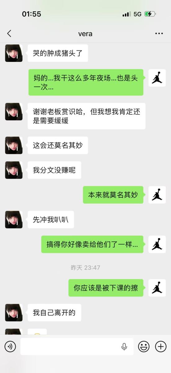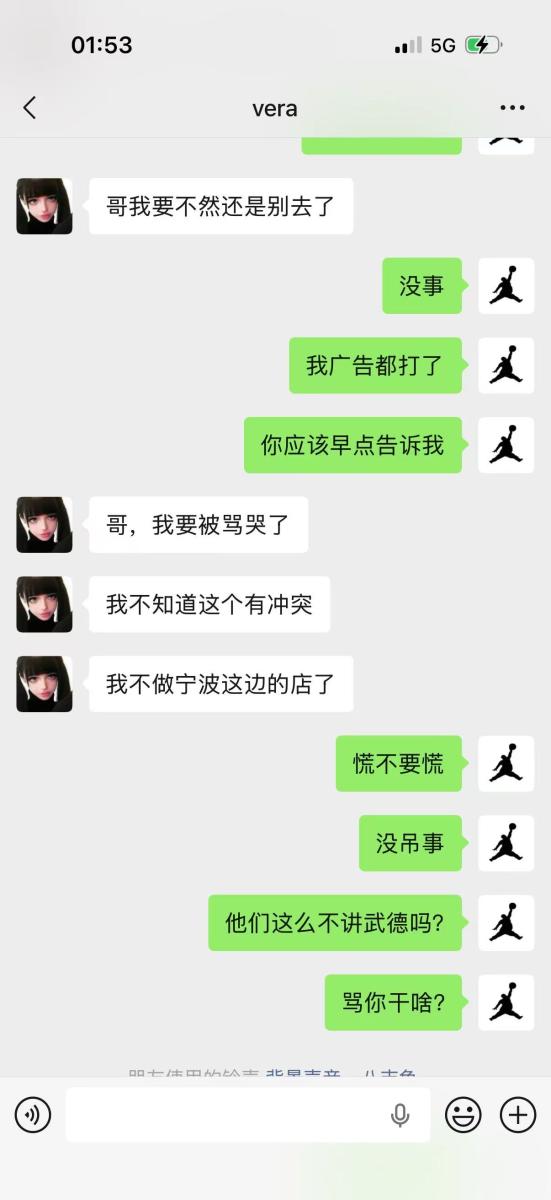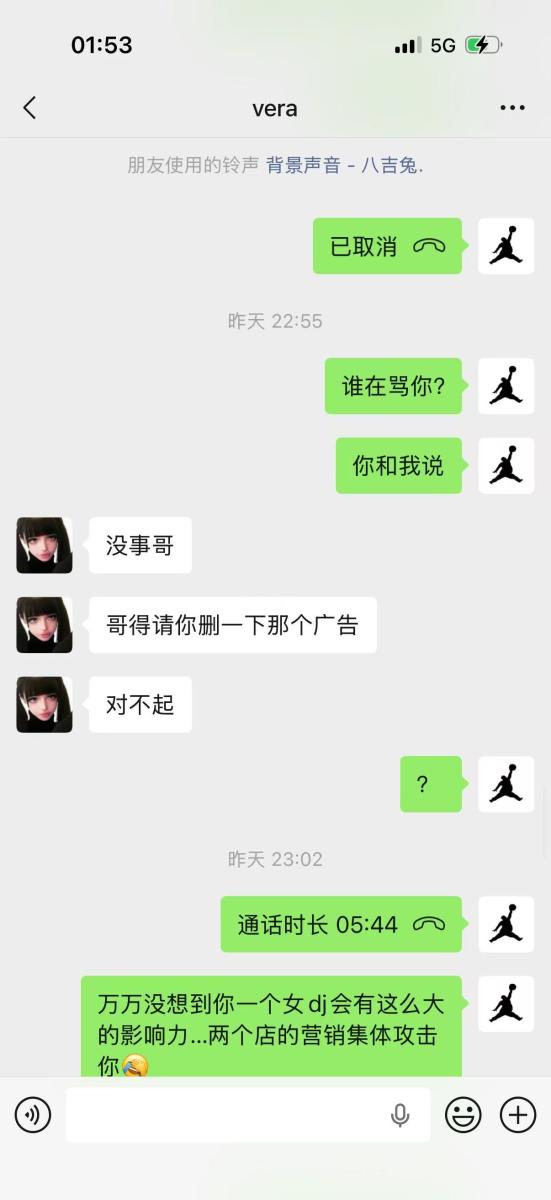 就在这个时候本年度最恶心的店方出现了,也就是本店的对手店,余姚帕蒂浩斯手段下作,对本店新定的女 DJ 疯狂私信辱骂,就因为这个女 DJ 在那个店干了两三个月就跟签了卖身合同一样,而且本店舞台总监也郑重跟女 DJ 说明,不用怕,有老板总监撑腰,安心上班。女 DJ 也是非不分,说再也不做宁波的店了,要撩场,转头跟帕蒂浩斯聊上班,在1 月 30 号 凌晨一点多,总监发现被这个司马女 DJ 拉黑,转头就被告知帕蒂浩斯方发朋友圈传 2月 1号入驻恶心店