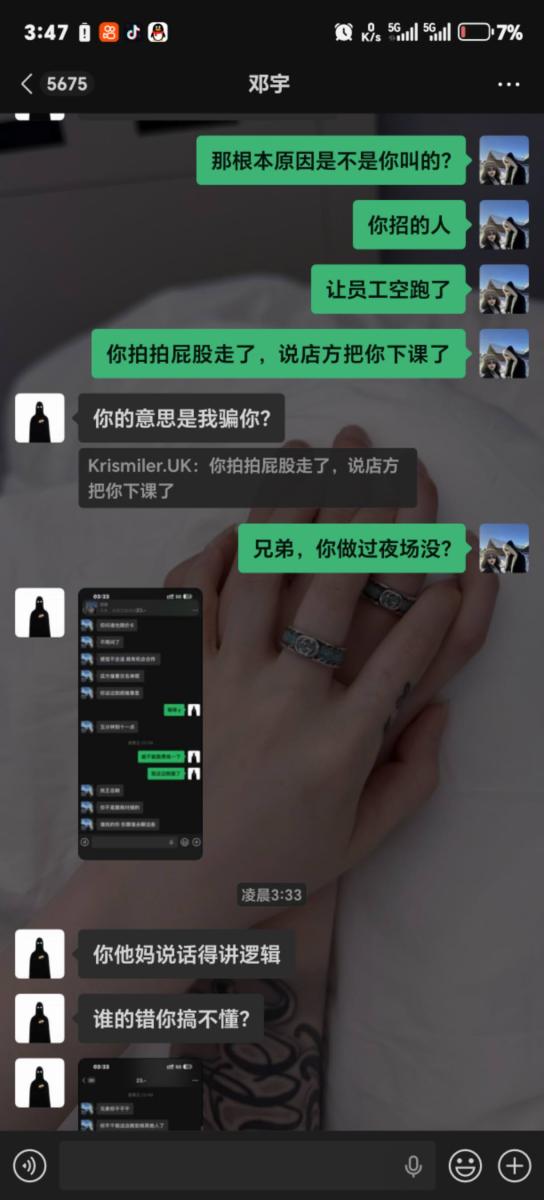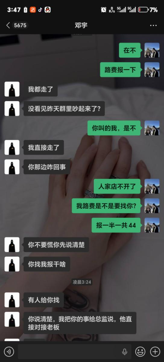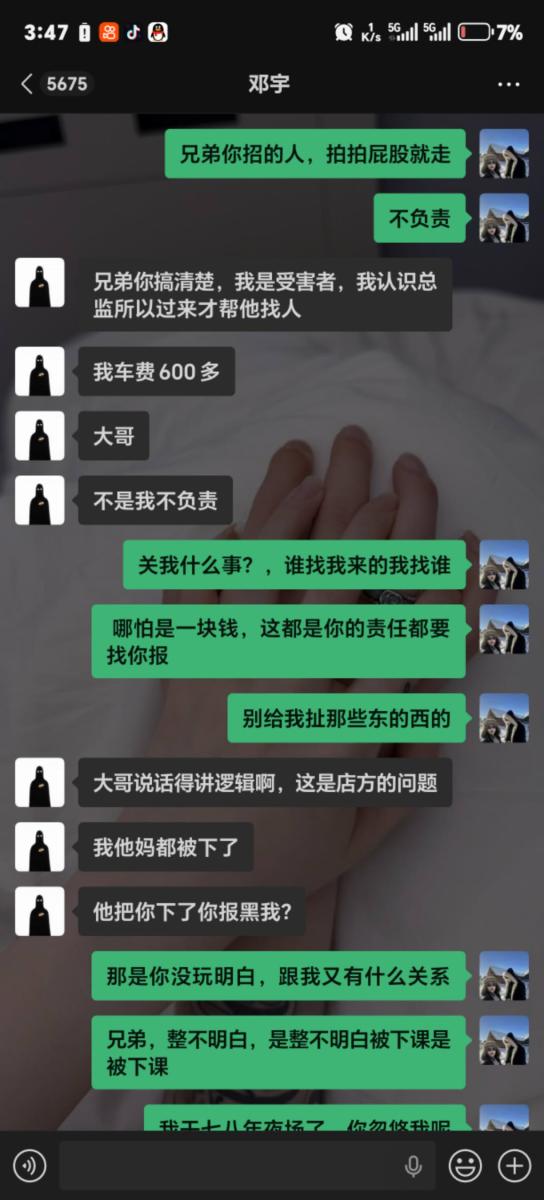 3. 毫无担当的巨婴:从头到尾,他对自己招人的行为不做任何解释,只拿“我只是帮忙的”当挡箭牌。连44元的路费都不肯承担,完全没有夜场人最基本的担当。